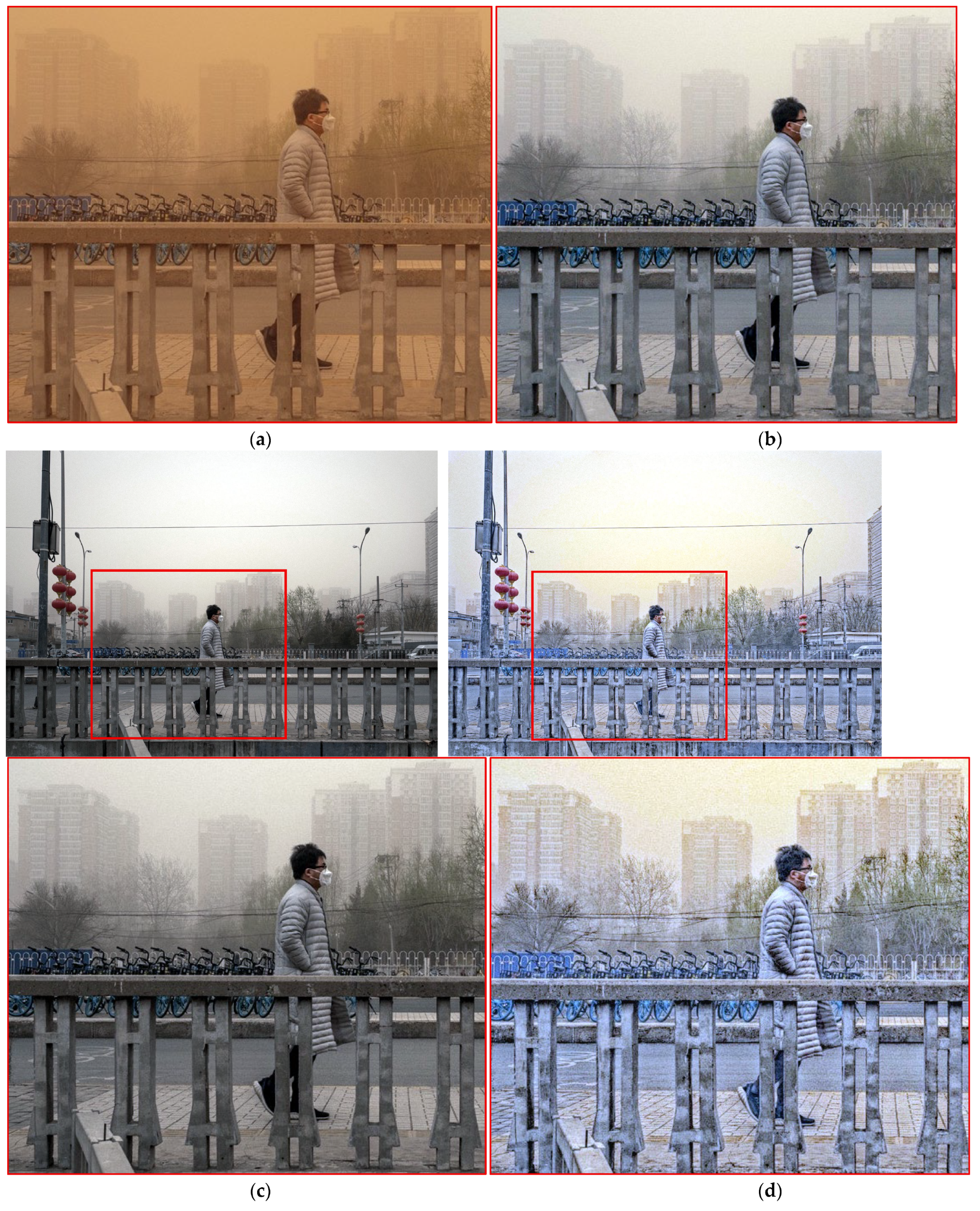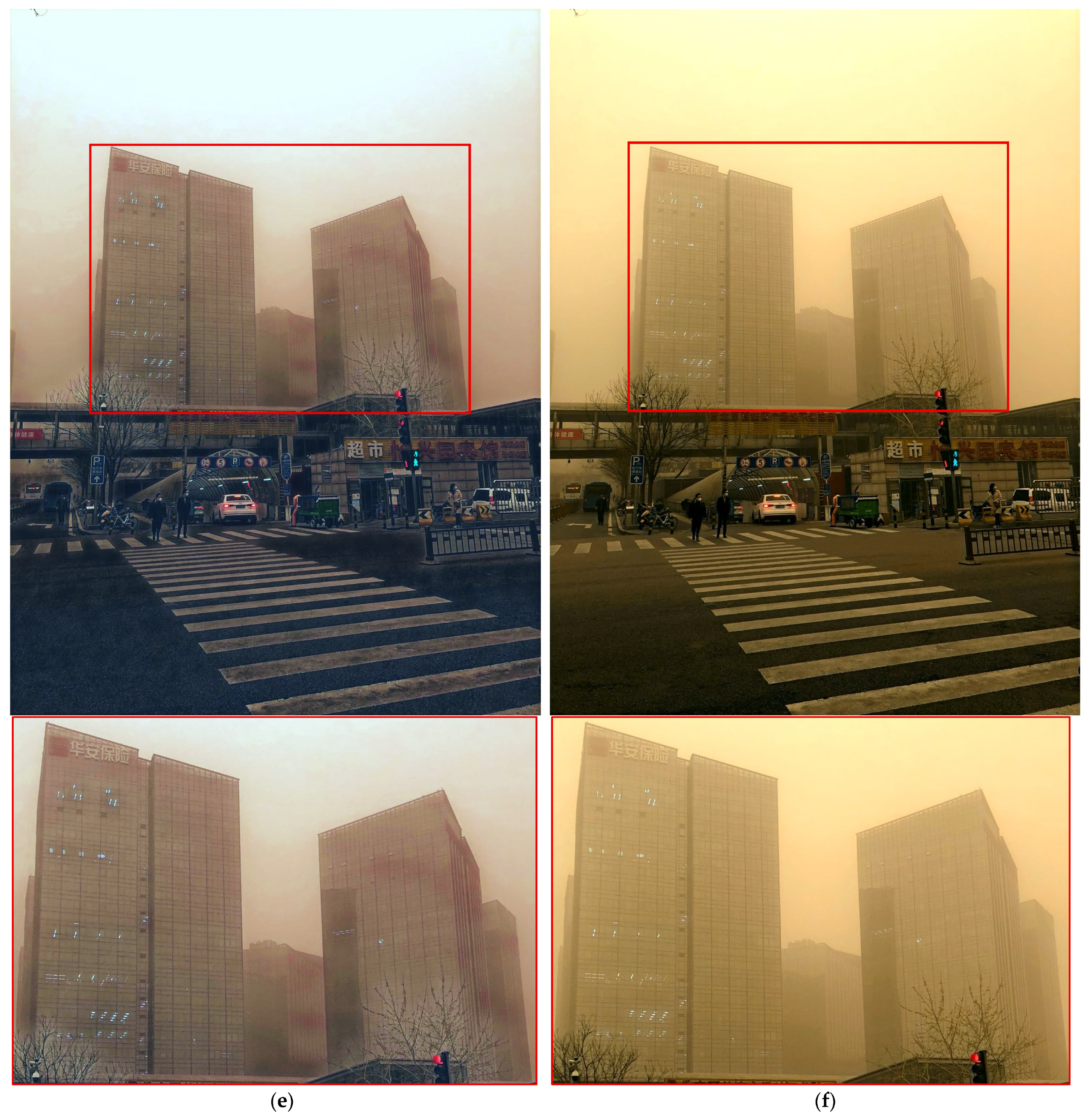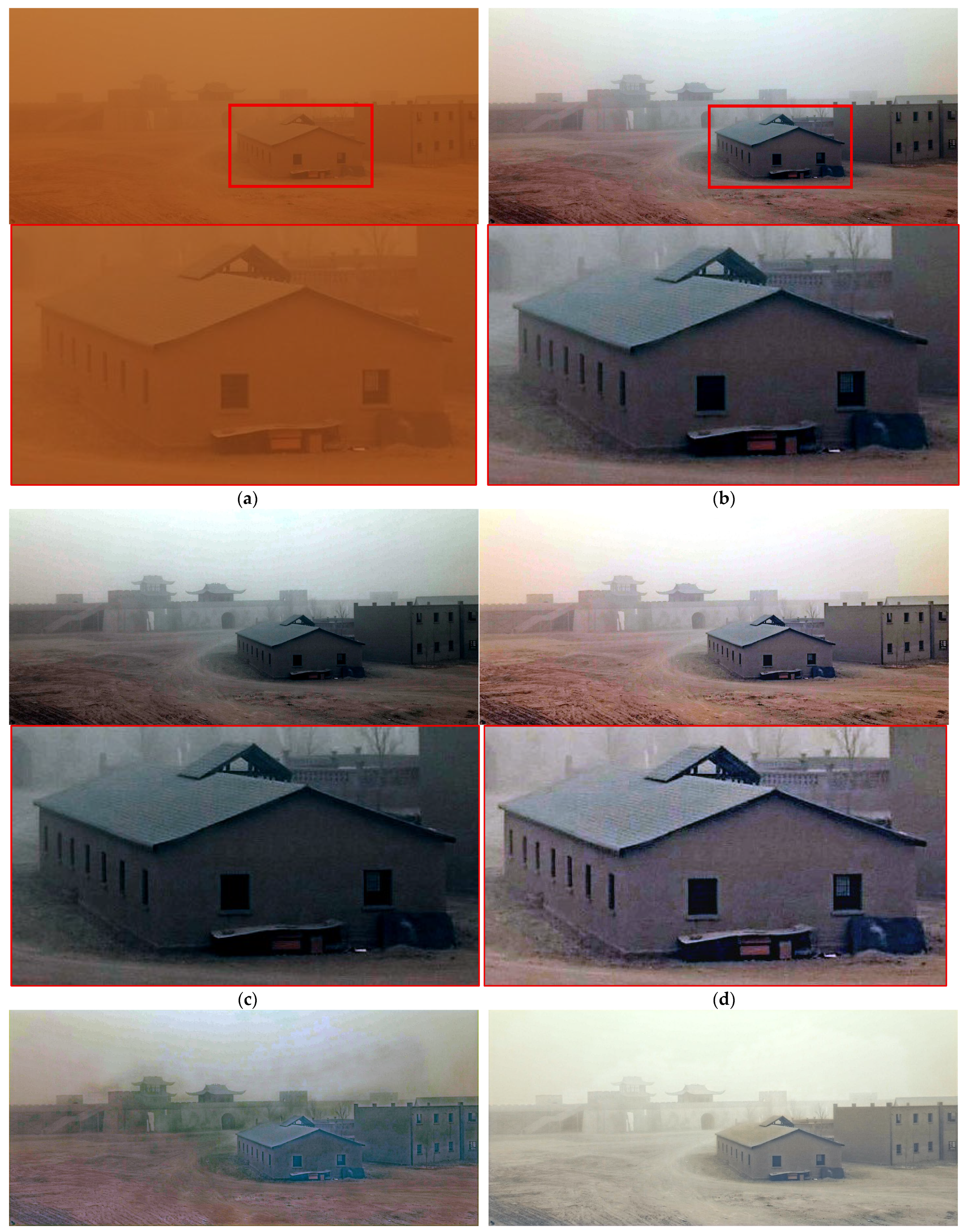 Figure 1a shows an original image during a sandstorm. After applying an SSR with a sigma value of five (