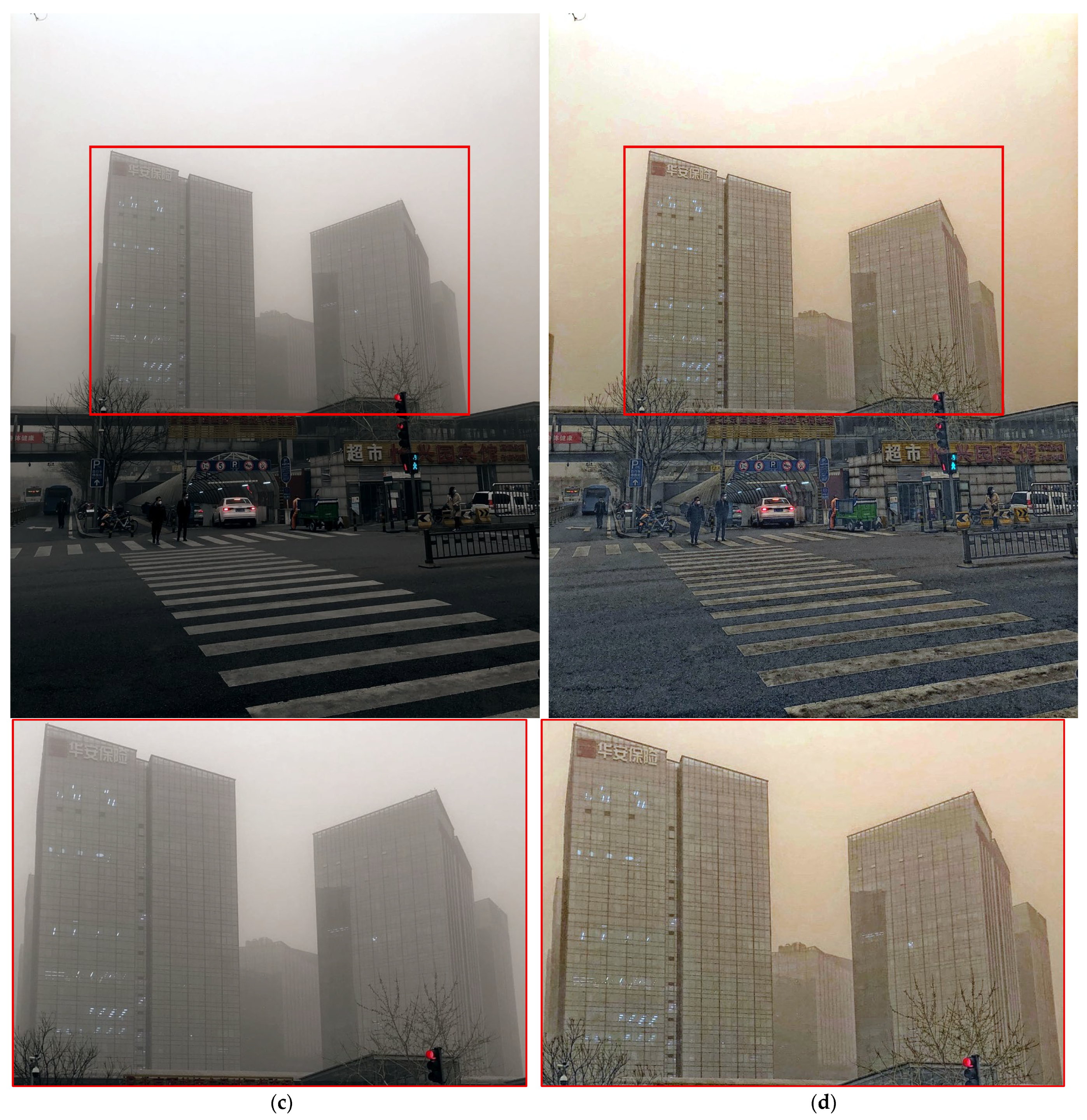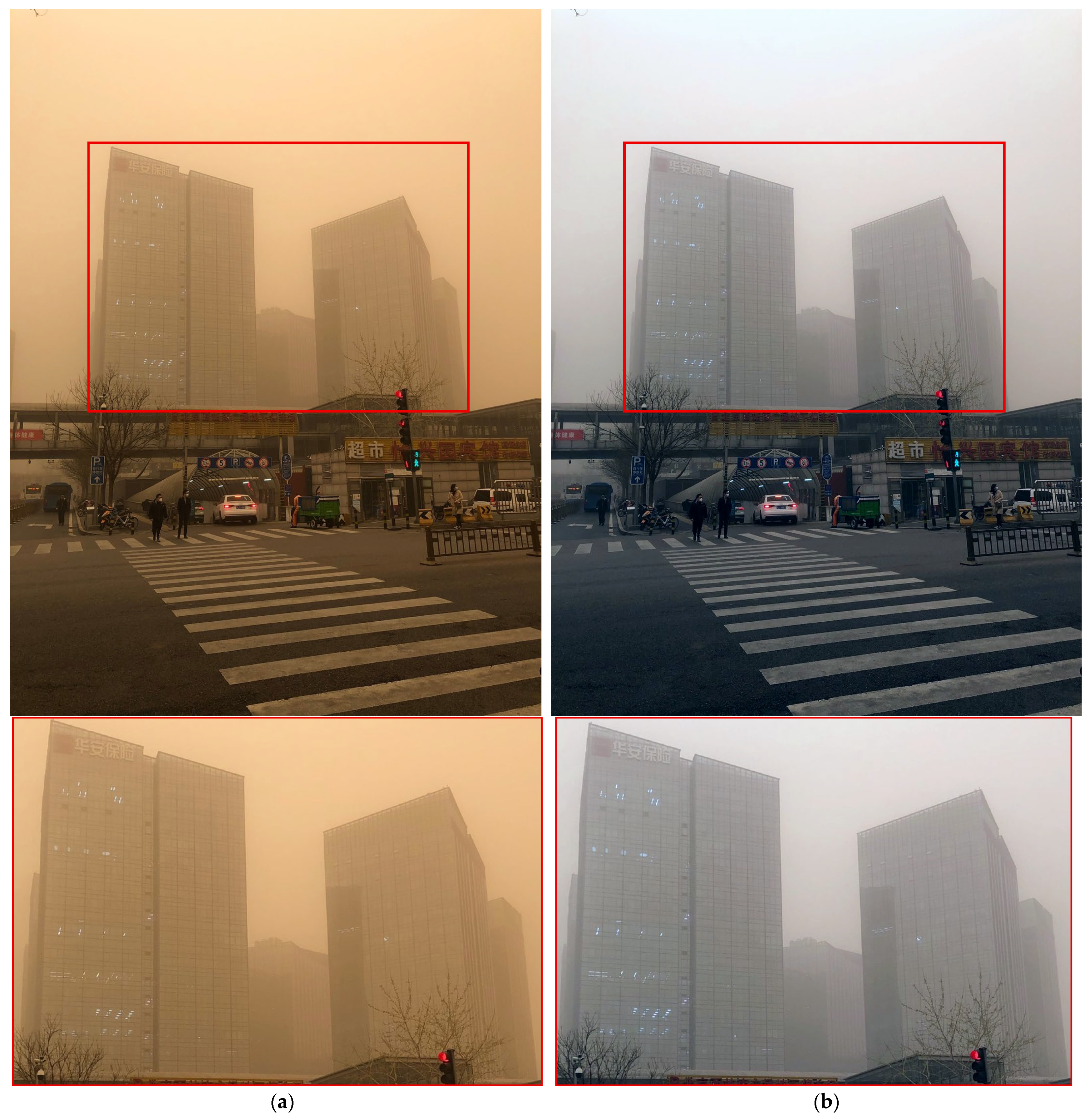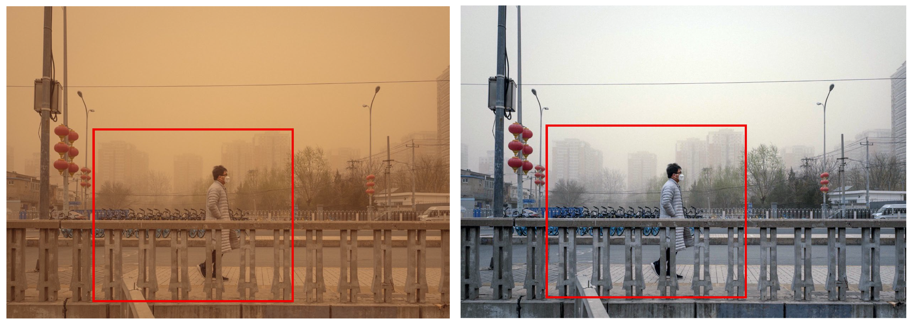 Figure 1a shows an original image during a sandstorm. After applying an SSR with a sigma value of five (