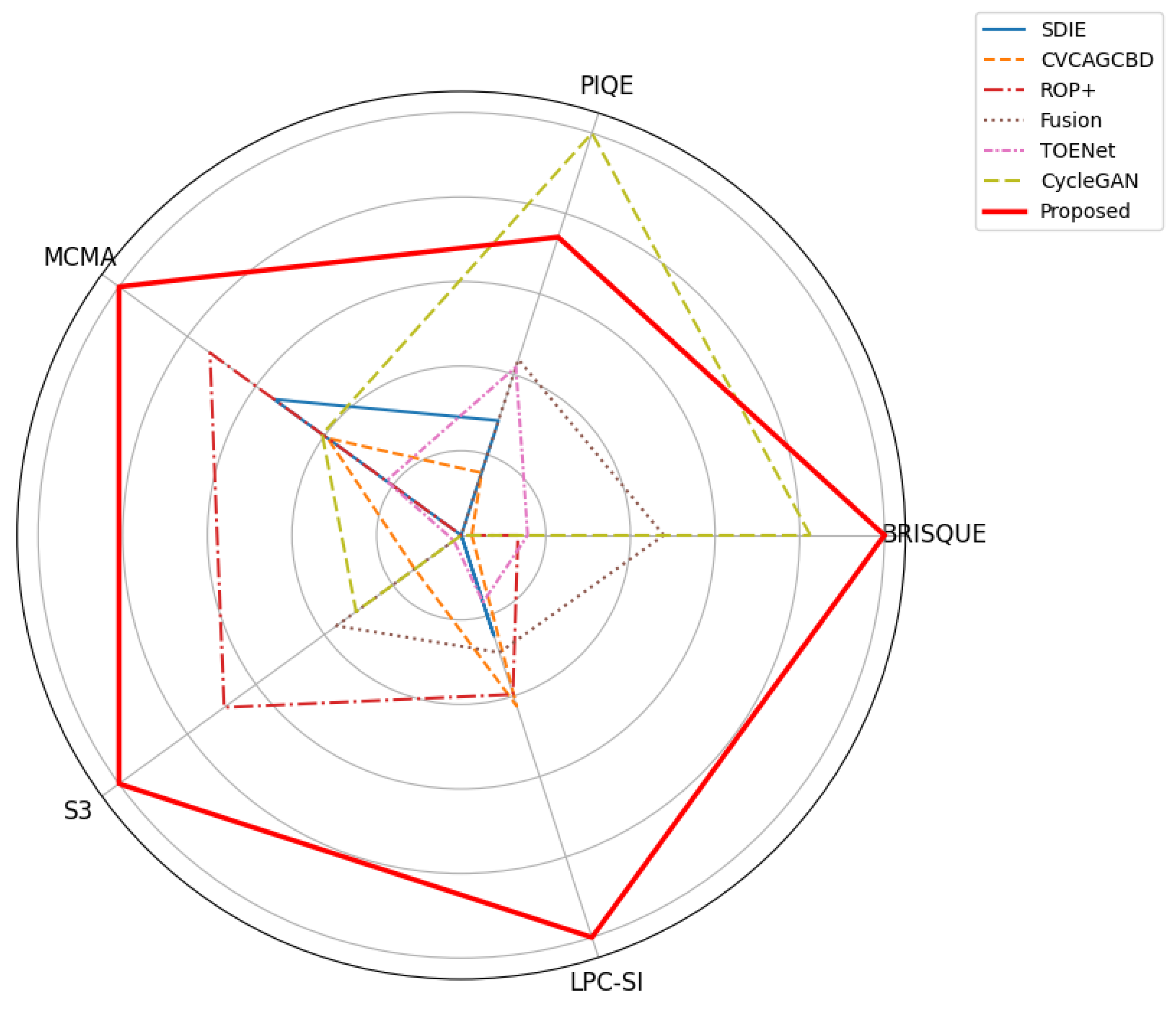 Figure 7 has color distortion, which is attributed to the Retinex enhancement process. During Retinex enhancement, luminance information is accentuated, while color information might undergo compression or alteration. Adjustments in brightness and contrast applied to individual color channels can disrupt the balance between them, leading to color distortion or loss and reducing the authenticity of image colors.
