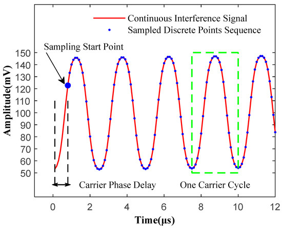 Figure 2 illustrates the relationship between the continuous interference signal and its discretized observation sequence. In this example, the analog carrier signal has a frequency of f0 = 400 kHz, while the sampling rate is fs = 10 MHz. The green rectangular frame highlights one complete carrier cycle, within which approximately fs/f0 = 25 sampling points are visible, as calculated by Equation (16). Note that Ncycle in Equation (16) may be non-integer, and sampling points may span multiple cycles.