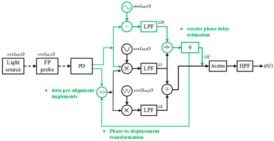 Flowchart of the delay phase pre-alignment compensation algorithm. The dashed arrow indicates optical signals. The modifications introduced by the algorithm proposed in this paper, compared to the traditional PGC demodulation algorithm, are highlighted in green.