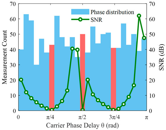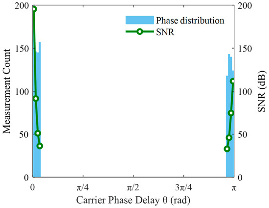 Comparing Figure 6 and Figure 8 reveals that in the traditional demodulation algorithm, phase delays were approximately uniformly distributed between 0~2π. Demodulation failure occurred near π/4, π/2, and 3π/4, where the SNR approached zero. In contrast, in Figure 8 using the pre-alignment demodulation algorithm, phase delays were mainly concentrated at 0 or π. At these values, both cos θ and cos 2θ are close to 1, completely avoiding demodulation failure. The minimum SNR of demodulated signal amplitudes reached 35 dB, indicating a 35 dB improvement in worst-case SNR compared to the traditional method.