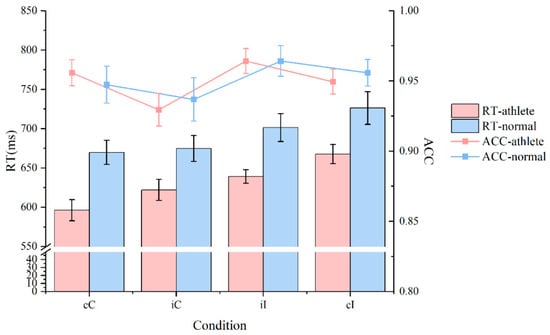 Figure 1 and Table 2 presents the accuracy of the two groups of participants under different experimental conditions. The results revealed that there was no significant difference in accuracy between the two groups. Specifically, in the cC condition, there was no significant difference in accuracy between sanda athletes and ordinary college students (F(1,36) = 0.012, p = 0.91). In the cI condition, there was no significant difference in accuracy between the two groups (F(1,36) = 0.37, p = 0.773). In the iC condition, there was no significant difference in accuracy between the two groups (F(1,36) = 0.61, p = 0.44). In the iI condition, there was no significant difference in accuracy between the two groups (F(1,36) = 0.006, p = 0.940). These results indicate that sanda athletes did not sacrifice task accuracy while improving response speed.