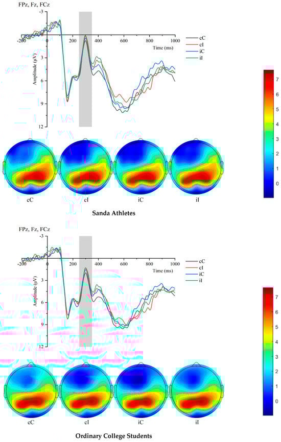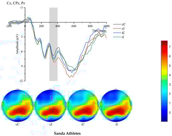 Table 4 presents the P300 amplitude of the two groups of participants under different experimental conditions. The results revealed that the sanda athletes exhibited significantly larger P300 amplitude in incongruent trials than in congruent trials. Specifically, in the cC condition, the P300 amplitude of sanda athletes was significantly larger than that of ordinary college students (F(1,36) = 4.82, p = 0.003). In the cI condition, the P300 amplitude of sanda athletes was significantly larger than that of ordinary college students (F(1,36) = 6.60, p = 0.014). In the iC condition, the P300 amplitude of sanda athletes was significantly larger than that of ordinary college students (F(1,36) = 4.31, p = 0.006). In the iI condition, the P300 amplitude of sanda athletes was significantly larger than that of ordinary college students (F(1,36) = 13.078, p < 0.001). Figure 3.
