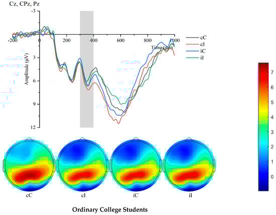 - ERP Indicators: These included the amplitude of ERP components such as N200, P300, and N400. The time window for N200 was 250–350 ms after stimulus presentation, with electrode sites selected at the mid-frontal region (FPz, Fz, and FCz). The time window for P300 was 300–400 ms after stimulus presentation, with electrode sites selected at the mid-parietal region (Cz, CPz, and Pz). The time window for N400 was 350–450 ms after stimulus presentation, with electrode sites selected at the mid-parietal region (Cz, CPz, and Pz).