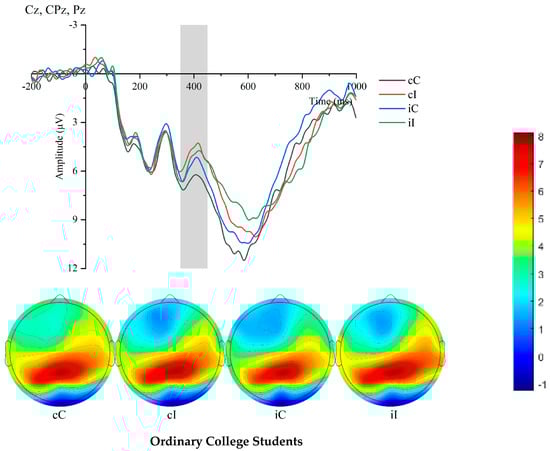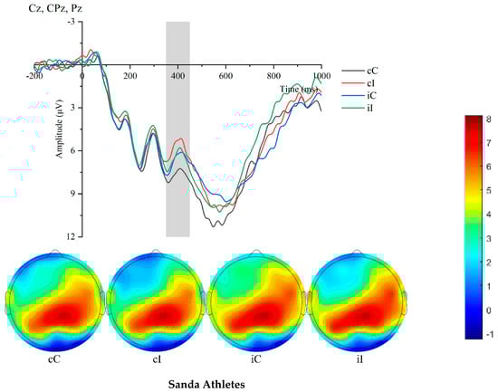 As shown in Table 5, the N400 amplitude of the two groups of participants under different experimental conditions was analyzed. The results indicated that the sanda athletes exhibited significantly larger N400 amplitude in incongruent trials than the ordinary college students. Specifically, in the cC condition, the N400 amplitude of sanda athletes was significantly larger than that of ordinary college students (F(1,36) = 9.78, p < 0.001). In the cI condition, the N400 amplitude of sanda athletes was significantly larger than that of ordinary college students (F(1,36) = 4.289, p = 0.046). In the iC condition, the N400 amplitude of sanda athletes was significantly larger than that of ordinary college students (F(1,36) = 3.51, p = 0.018). In the iI condition, the N400 amplitude of sanda athletes was significantly larger than that of ordinary college students (F(1,36) = 4.12, p = 0.050).