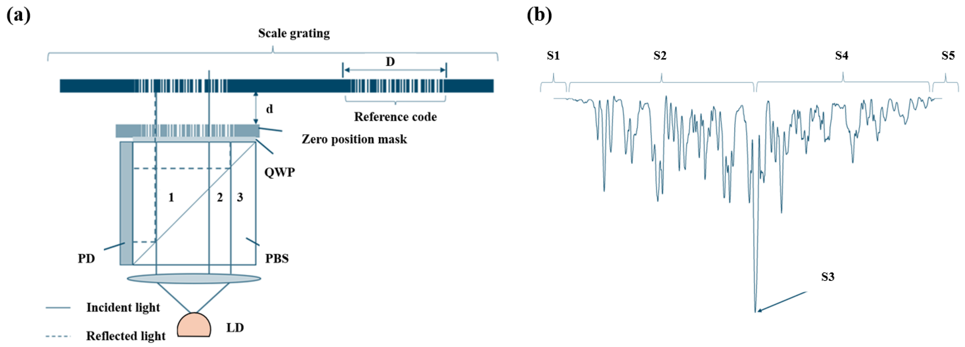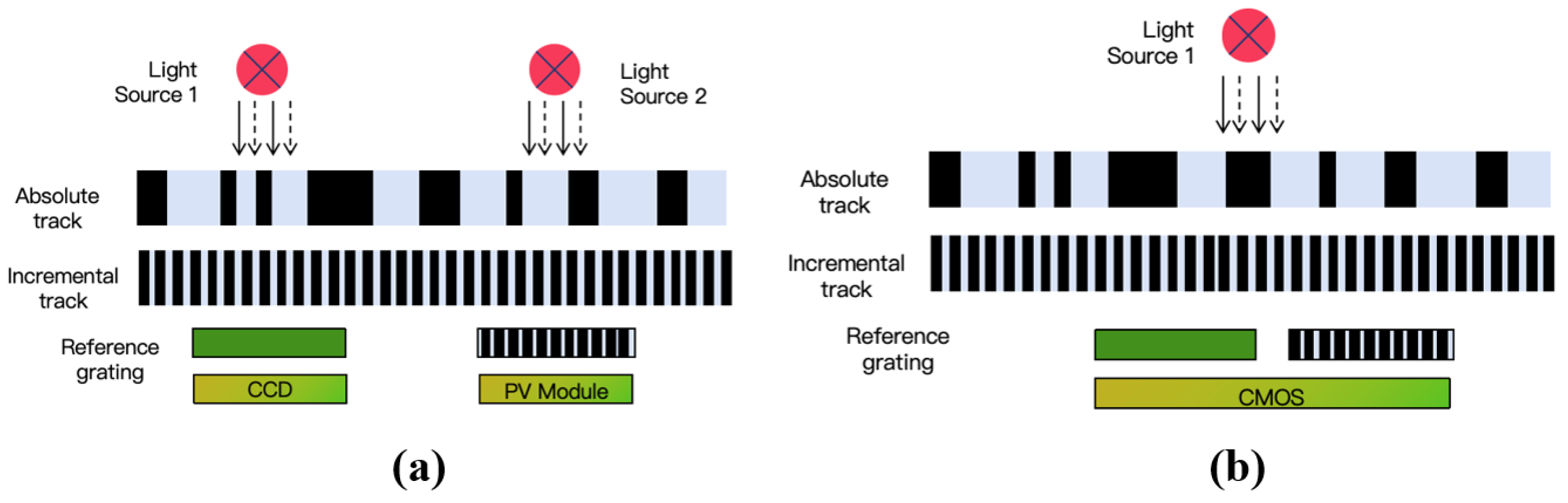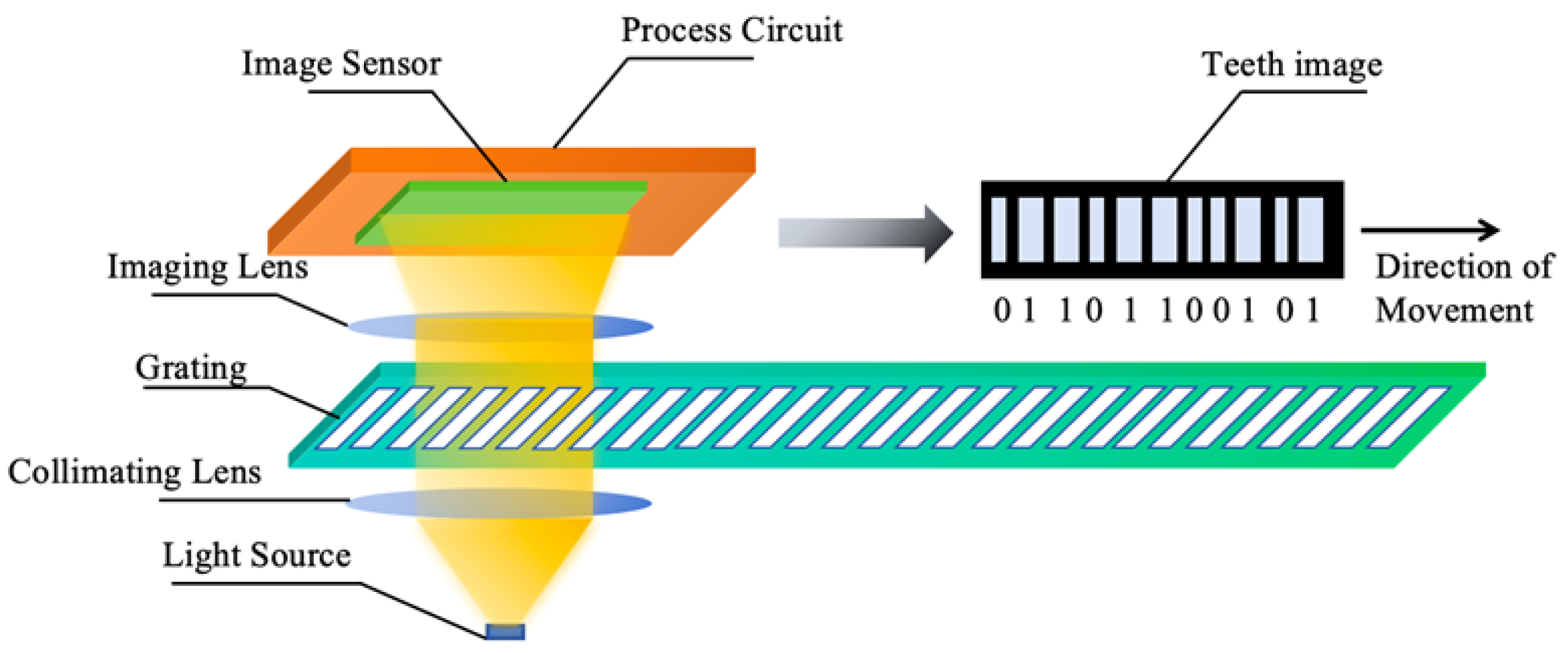 - Ding, H. Principle and Implementation of Absolute Single-Track Linear Displacement Grating Sensor. Ph.D. Thesis, Changchun University of Science and Technology, Changchun, China, 2016. [Google Scholar]