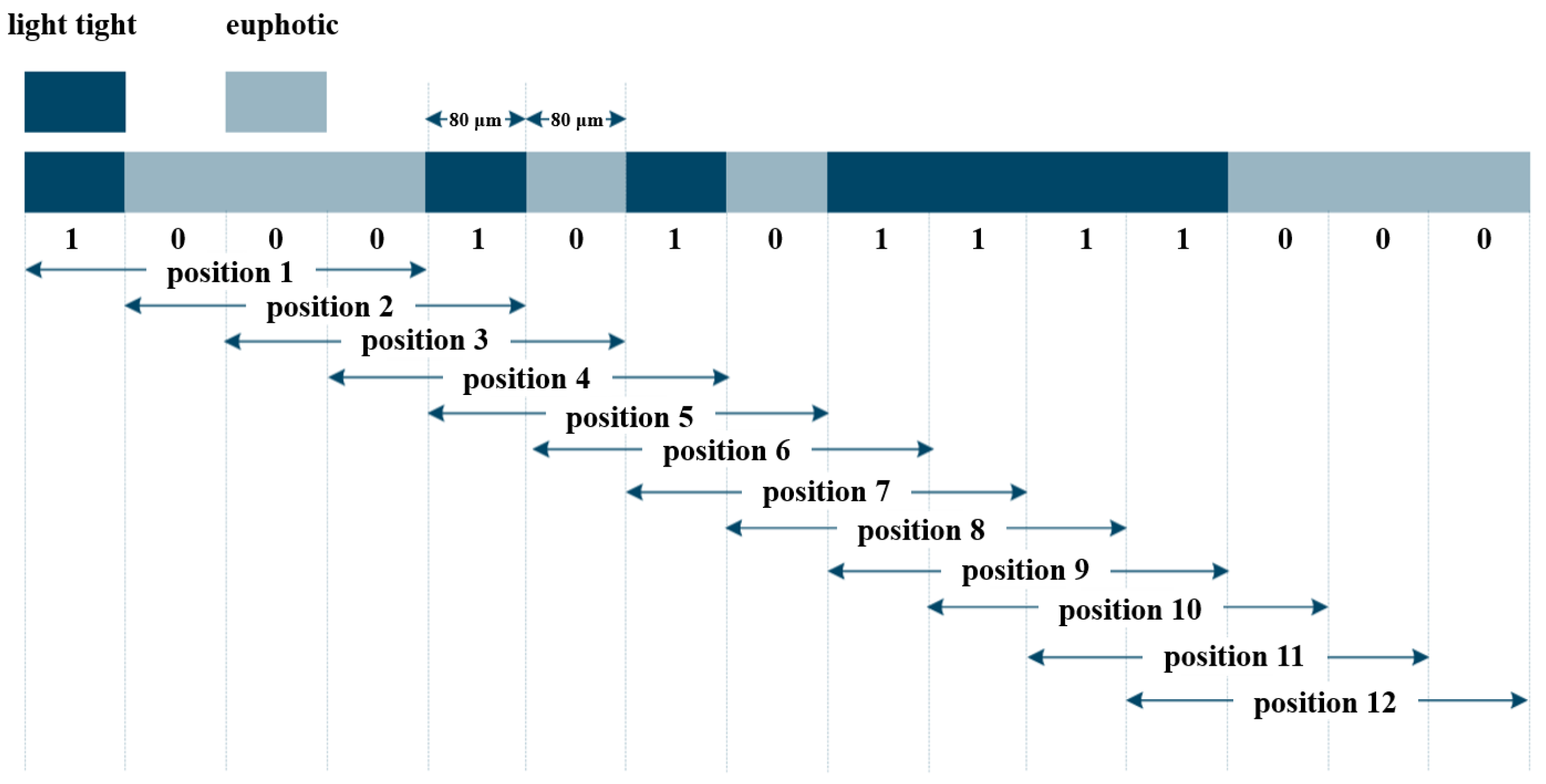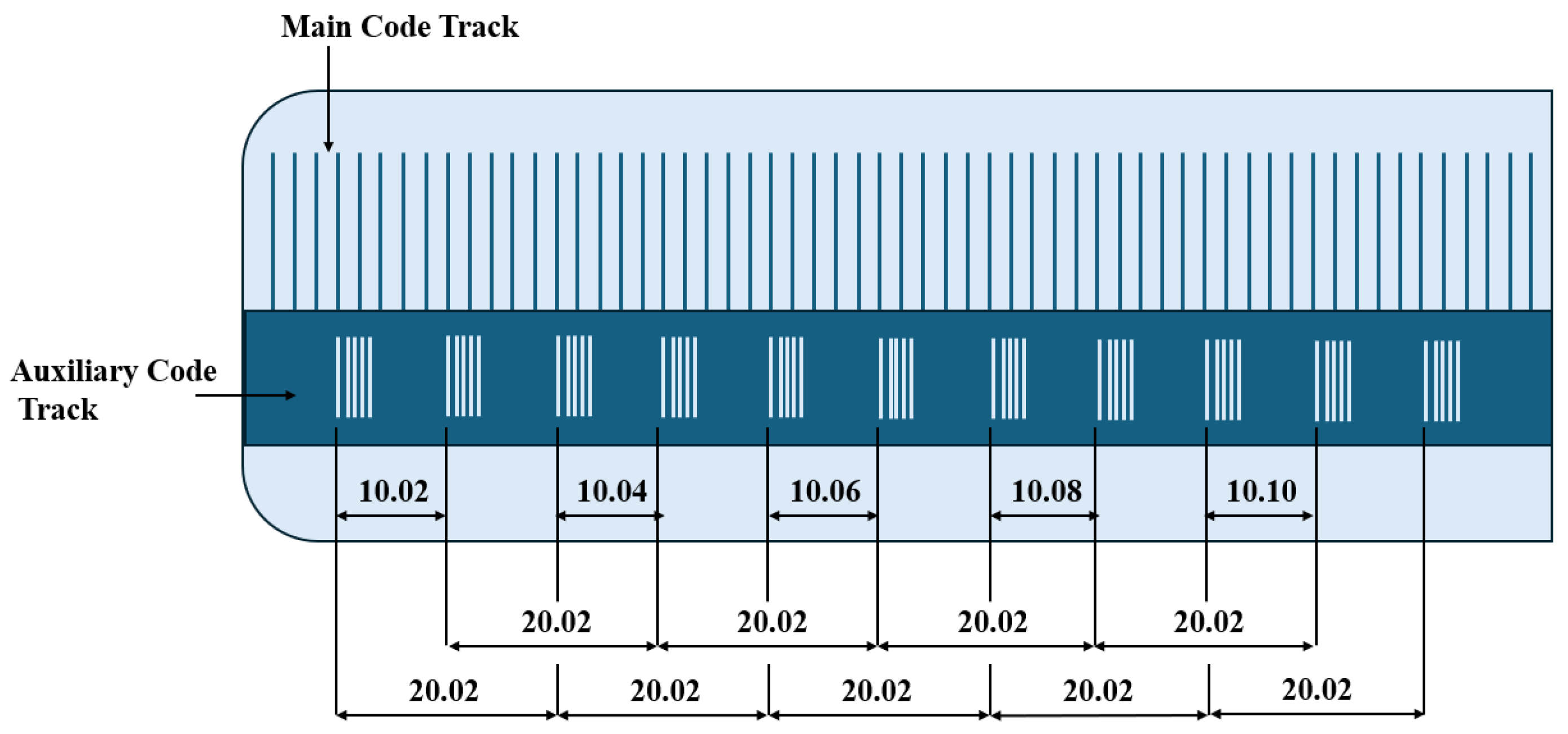 - Multi-track binary pseudorandom code encoding method: This method extends the single-channel pseudorandom code encoding approach by inscribing multiple pseudorandomly encoded real code tracks onto the linear encoder body. Clear periodic progression exists among the tracks, with the period of each adjacent track decreasing sequentially (i.e., each preceding track has a period that is one unit shorter than the next). Although this method requires a more complex readhead and increases the manufacturing complexity, it allows for the direct output of absolute position values, thereby improving the practicality of the measurement system.