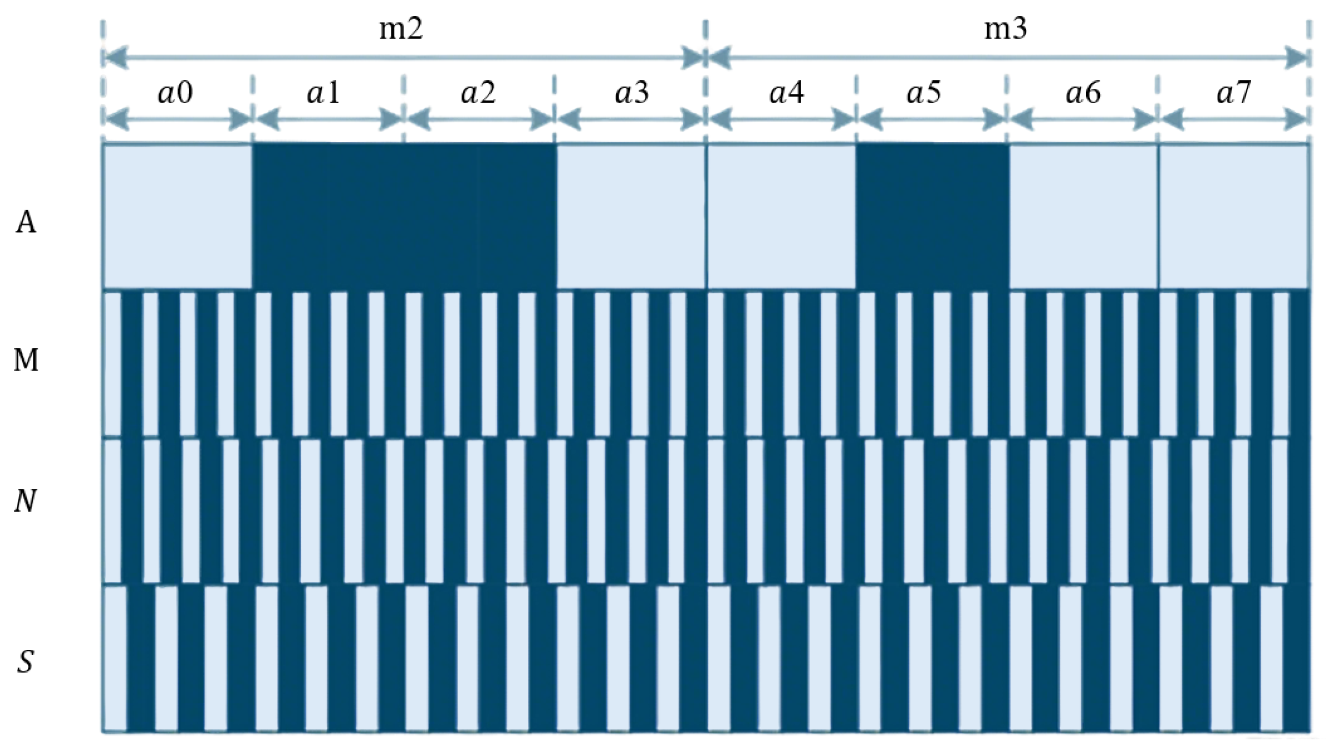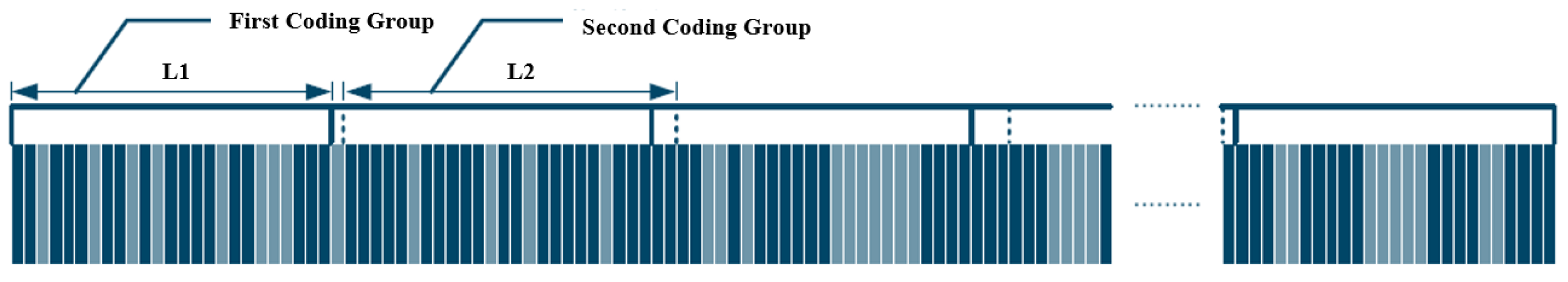 - Multi-track p-ary pseudorandom code encoding method: This method is derived from the single-channel pseudorandom encoding approach, with its main enhancement being the expansion of the information capacity by introducing multi-bit encoding to form a p-ary structure. By increasing information redundancy, this multi-valued encoding design effectively reduces the bit error rate during signal transmission and enhances the system’s resistance to interference. Similarly to multi-track binary encoding, it requires a complex readhead, which adds to the manufacturing complexity, but it enables the stable output of absolute position values.