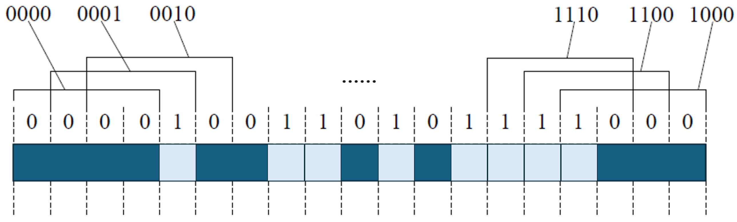 - Triple pseudorandom sequence combination encoding method: This method uses a combination of three pseudorandom sequences with cyclic periods , , and for encoding. The bit lengths of the three sequences are 10 bits, 7 bits, and 3 bits, respectively, corresponding to periods of , , and . The bit lengths match their respective period values. The specific sequences are as follows: