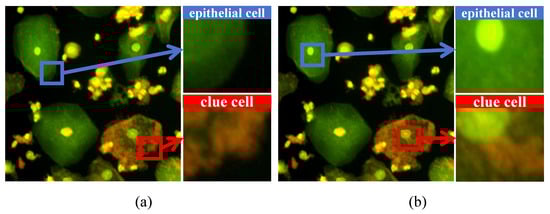 The fluorescence microscopy image dataset used in this study was collected by Suzhou Tumo Medical Technology Co., Ltd. (Suzhou, China). It comprised 2314 images from 480 patients, with each patient contributing 2 to 8 images. For each patient, gynecological vaginal discharge samples were collected, and slides were prepared through a standardized process of dilution and staining. The prepared slides were then imaged using a fully automated immunofluorescence detection device (model YG02). The original image resolution was 2736 × 1824 pixels. Due to computational constraints and the need for efficient slide analysis, a standard preprocessing pipeline was initially applied, where original images were down-sampled to 1368 × 912 pixels and further cropped into four 684 × 456-pixel images. However, for the specific purposes of this research, we adopted a different strategy. Each original image was randomly cropped to 1024 × 1024 pixels and then down-sampled to a final input size of 512 × 512 pixels. Ultimately, our final dataset consisted of 2314 images. Among these, 455 images contained clue cells, while 1859 did not. The dataset was partitioned into a validation set of 576 images (containing 231 clue cell instances) and a test set of 477 images (containing 144 clue cell instances). The primary goal of this study was to detect these clue cell targets. As visually detailed in Figure 1, the main challenge lay in distinguishing clue cells from normal epithelial cells based on subtle differences in their edge characteristics (Figure 1a) and surface texture (Figure 1b).