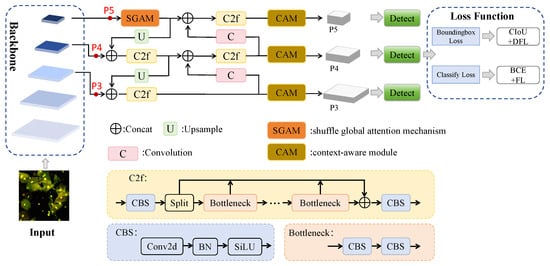 The overall workflow of our research is illustrated in Figure 2. The process begins with data acquisition and preprocessing, followed by patient-level partition of the dataset. The core of our approach is the training and optimization of our proposed CA-YOLO model, followed by a rigorous performance evaluation to generate the final detection results. This section details the key components of our model. The CA-YOLO model, as shown in Figure 3, is built on the YOLOv8 framework and takes a 512 × 512 pixel image as input. Our key innovation lies in the introduction of two collaborative modules within the neck structure to detect clue cells: the CAM is designed to capture the complex distribution patterns of bacteria attached to the cell surface. The SGAM enhances information interactions across channels and spatial locations, significantly improving the model’s ability to detect fuzzy cell boundaries. After being enhanced by these modules, the features are passed to the detection head for final prediction. The model’s loss function combines CIoU and distributional focal loss for bounding box regression, and binary cross-entropy and focal loss for classification. The following subsections describe each innovative component in detail.