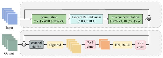 where represents permutation operation, and represent fully connected layers, and and denote the ReLU and Sigmoid activation functions, respectively. The output of the channel attention is obtained as ), where ⊙ denotes element-wise multiplication.