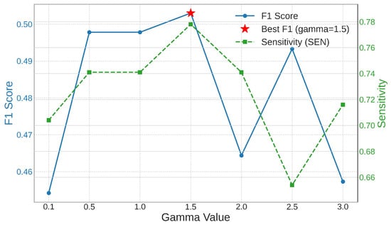 The is used to statically balance the importance of different classes. We determine the weight of each class based on the inverse frequency of the corresponding class in the training set. This data-driven approach assigns higher weights to rarer clue cells, allowing the model to pay more attention to them during training. To ensure fair and consistent experimental evaluation, the pre-computed remains unchanged in all subsequent experiments. The enables the model to focus on misclassified samples by dynamically adjusting the loss contribution of easy and difficult samples. To explore its optimal value, we conducted a sensitivity analysis. We trained the full CA-YOLO model with different values ranging from 0.1 to 3.0, keeping all other settings and unchanged. Figure 6 shows the changes in SEN and F1 score on clue cells under different values of the model. As shown in Figure 6, as the increases from 0.1 to 1.5, the SEN and F1 score increase steadily and reach a peak at . This shows that a moderate focusing effect is beneficial to our task, which can effectively reduce the loss from easy-to-classify background samples and help the model prioritize more difficult samples, thereby improving its precision without significantly affecting the recall. However, when the increases further, the model performance begins to decline. This is because a large overly suppresses the loss of classified samples, which may hinder the overall learning process and stability of the model.