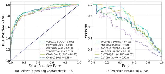 In order to conduct a more comprehensive and threshold-independent evaluation of the CA-YOLO model, we plotted the Receiver Operating Characteristic (ROC) curves and Precision–Recall (PR) curves on the test set, as shown in Figure 9. As can be seen from the ROC curve, the Area Under Curve (AUC) values of all models are high and very close together, indicating that these detection models can effectively distinguish clue cells from the background. However, since the ROC curve is insensitive to a large number of true negative samples (i.e., correctly identified background areas) in the dataset, its discrimination in class imbalance scenarios is relatively limited. Considering that our task is to detect clue cells, a sparse target that accounts for a small proportion of the image and is easily confused with the background or other cells, the PR curve, as the gold standard for measuring the performance of the model in identifying positive samples, is more advantageous in this scenario. As can be seen from the PR curve, the CA-YOLO model achieved the highest AUPRC value of 0.724. More importantly, the PR curve of the CA-YOLO model is above other curves in most recall intervals, which shows that CA-YOLO can complete the task with a lower false detection rate, whether under a conservative detection strategy (low recall) that requires high precision or a comprehensive search strategy (high recall) that pursues a high detection rate. This feature is crucial for clinical auxiliary diagnosis application scenarios that require high reliability, because it directly affects whether accurate and reliable reference information can be provided to doctors.