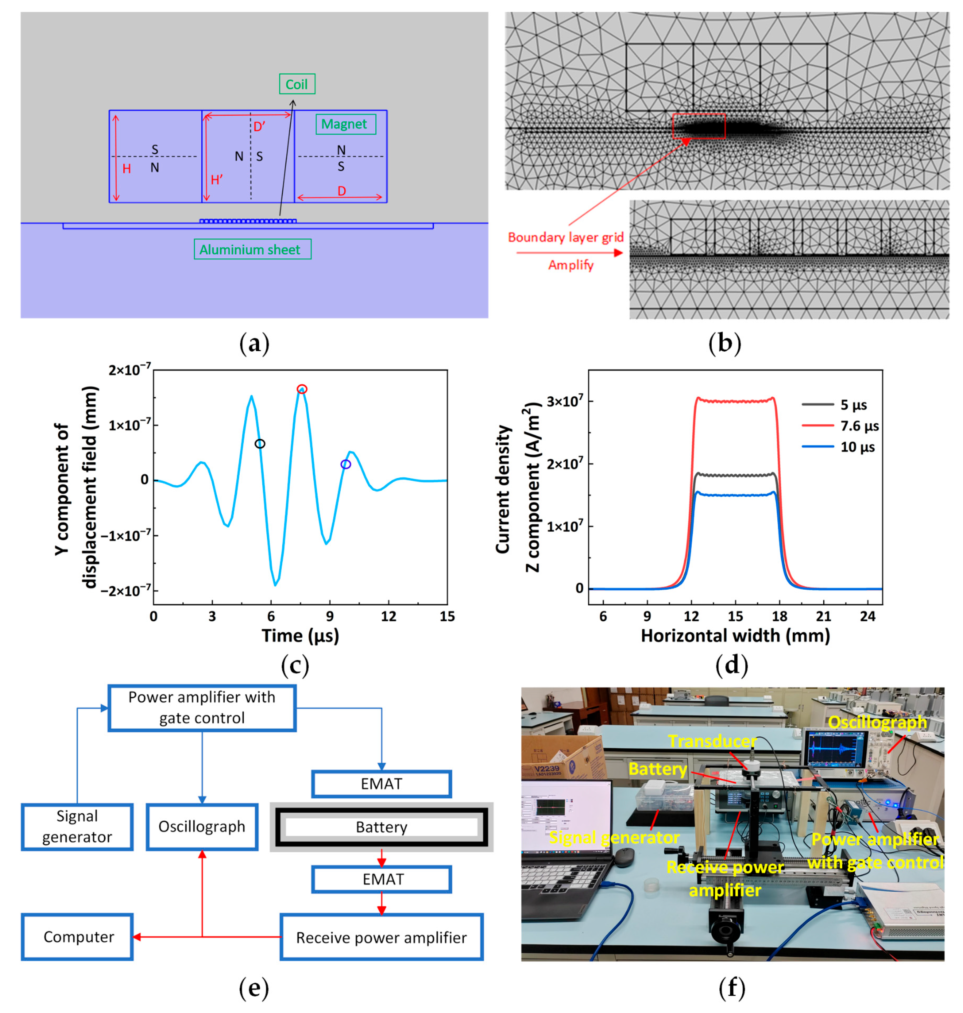 Based on the internal ultrasonic transmission characteristics of LIBs and the principle of electromagnetic ultrasonic excitation, an EMAT for battery detection is designed. This structure integrates magnets, coil configurations, and matching circuits. Finite element modeling and simulation methods are employed to optimize the static magnetic field strength and eddy current distribution density, significantly enhancing the transducer’s performance. By comparing the received signals of the probe before and after optimization, the impact of parameter optimization on the amplitude of the detection signal is quantitatively verified.