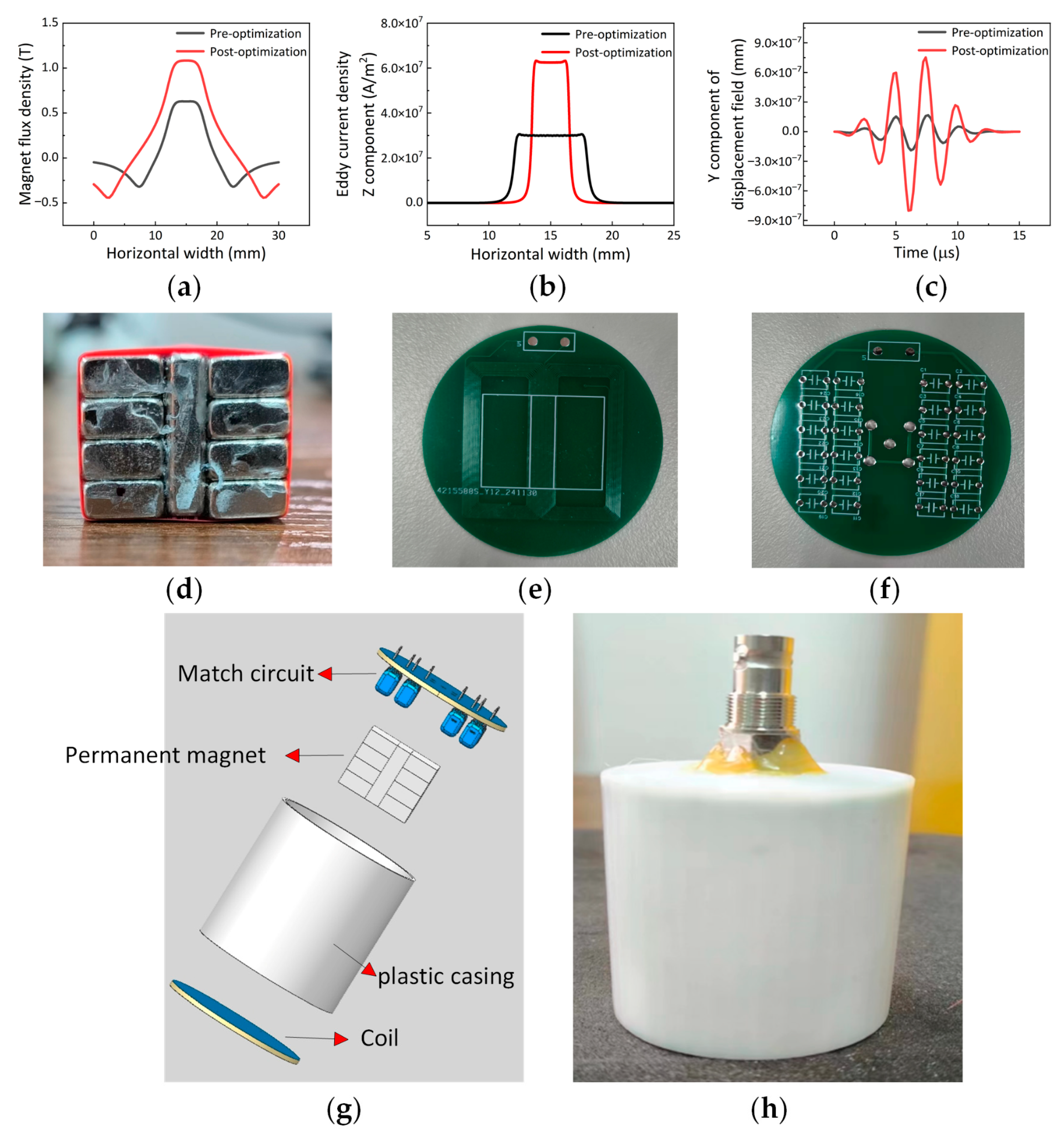 Figure 6d. Specifically, a high flux density occurs near the coil (indicated by the white ring), while a low flux density appears on the upper surface of the permanent magnet (indicated by the yellow ring). This observation not only aligns with the optimization of the EMAT but also confirms the feasibility of the Halbach configuration from this perspective.
