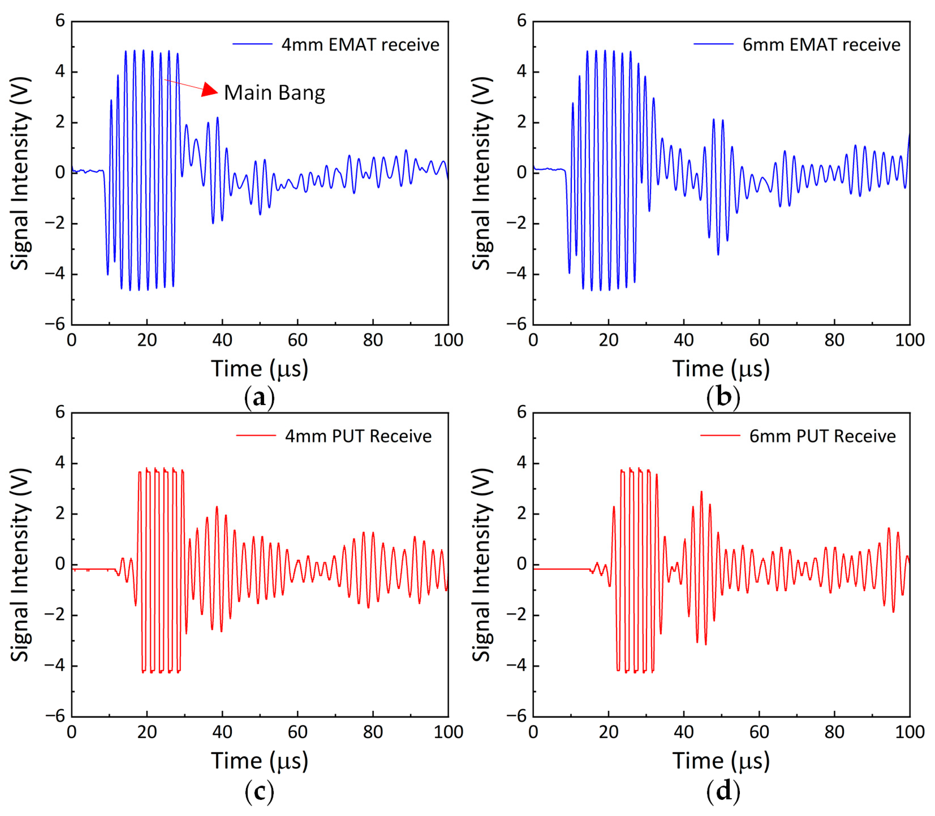Figure 8a–d, both electromagnetic ultrasonic testing and piezoelectric ultrasonic testing exhibit significant and identifiable characteristic response curves in terms of signal feature analysis. The two methods demonstrate a high degree of consistency in the distribution of characteristic regions. However, due to the higher excitation voltage of electromagnetic ultrasound and the greater amplification of the received signal, the background noise level in the acquired signal is relatively elevated. Further calculations reveal that the Time of Flight (ToF) data in