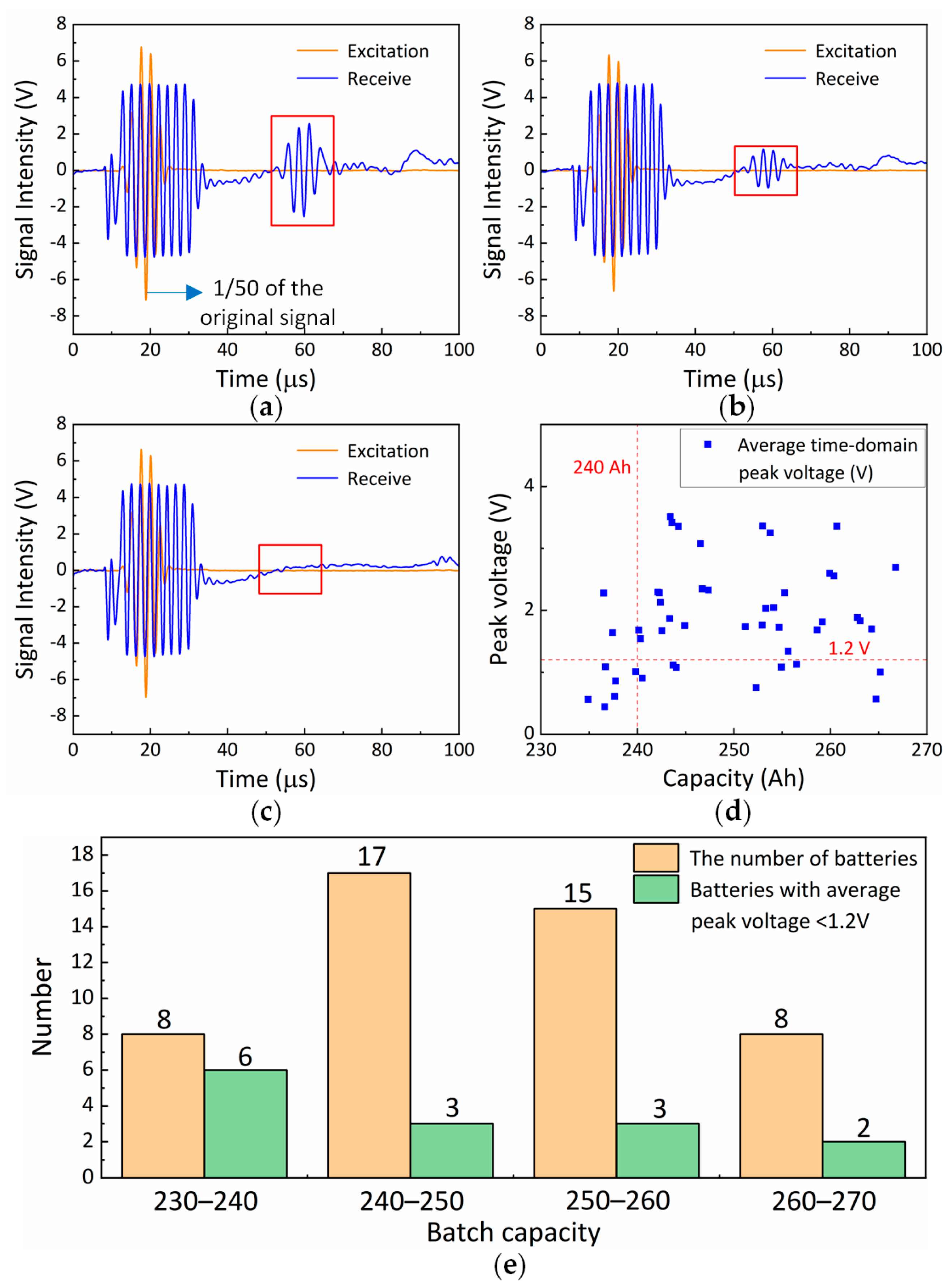 Figure 9d, most average time-domain peaks of batteries with capacities between 230 and 240 Ah are below 1.2 V, whereas most batteries with capacities exceeding 240 Ah have average time-domain peaks above 1.2 V.