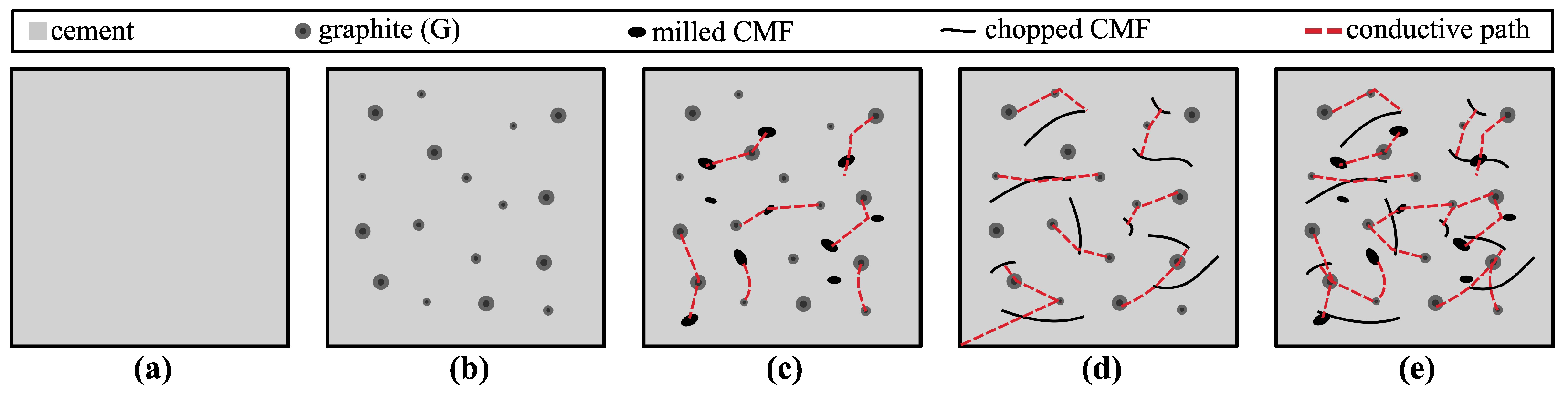 - Zhao, Y.; Zhang, J.; Qiang, S.; Lu, H.; Li, J. Effect of carbon fibers and graphite particles on mechanical properties and electrical conductivity of cement composite. J. Build. Eng. 2024, 94, 110036. [Google Scholar] [CrossRef]