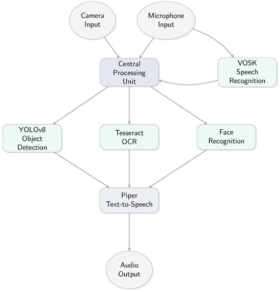 The architecture adopts a modular structure, enabling each core function to operate independently or in combination depending on the selected mode. Voice commands serve as the primary user interface, while auditory feedback ensures seamless and intuitive interaction. The overall workflow is optimized for minimal latency and high usability, allowing the user to switch modes dynamically without manual intervention—ideal for hands-free operation in real-world settings.
