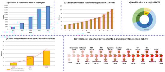 Statistical overview of the literature on transformers. (a) Number of citations per year for transformer papers. (b) Citations in the last 12 months on detection transformer papers. (c) Modification percentage in the original detection transformer (DETR) to improve the performance and convergence speed. (d) Number of peer-reviewed publications per year that used DETR as a baseline. (e) A non-exhaustive timeline overview of important developments in DETR for detection tasks.