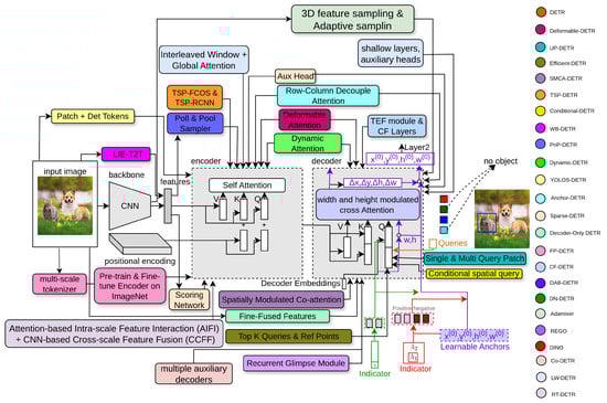 An overview of the detection transformer (DETR) and its modifications proposed by recent methods to improve performance and training convergence. It considers the detection a set prediction task and uses the transformer to free the network from post-processing steps such as non-maximal suppression (NMS). Here, each module added to the DETR is represented by different color with its corresponding label (shown on the right side).