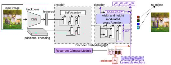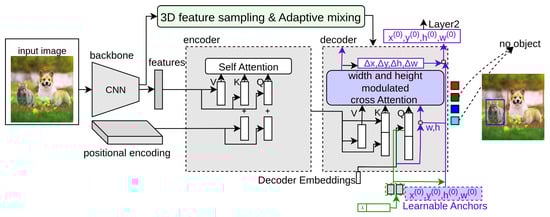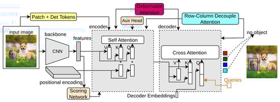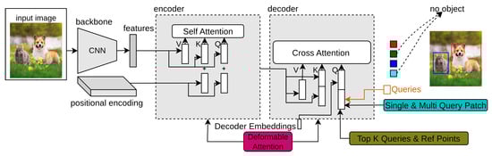 In this context, Carion et al. (2020) proposed the detection transformer (DETR) [11], a novel framework that replaces traditional region proposal-based methods with a end-to-end trainable architecture using a transformer encoder–decoder network. The DETR network demonstrates promising performance, outperforming conventional CNN-based object detectors [12,13,14,15,16,17,18,19], while also eliminating the need for components such as region proposal networks and post-processing steps like non-maximum suppression (NMS) [7]. Despite these advantages, DETR has certain limitations, including slow training convergence and reduced performance on small objects, which have motivated numerous modifications and improvements in subsequent research.