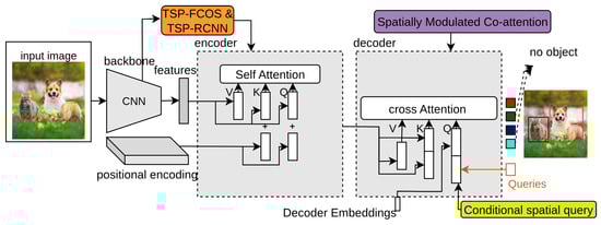 The structure of the original DETR after the addition of SMCA-DETR [23], TSP-DETR [24], and Conditional-DETR [25]. Here, the network is a simple DETR network, along with improvement indicated with small colored boxes. The purple block indicates SMCA-DETR, the orange block indicates TSP-DETR, and the yellow box represents Conditional-DETR.