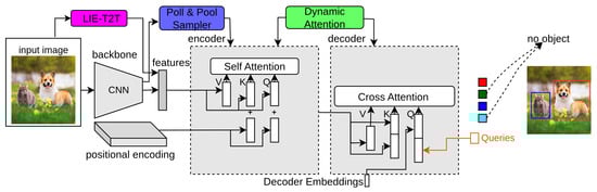 The structure of the original DETR after the addition of WB-DETR [26], PnP-DETR [27], and Dynamic-DETR [28]. Here, the network is a simple DETR network, along with improvement indicated with small colored boxes. The Magenta block indicates WB-DETR, the blue block indicates PnP-DETR, and the green box represents Dynamic-DETR.