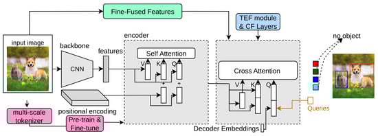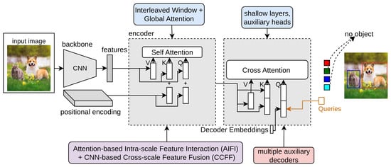 Object detection is a fundamental task in computer vision that involves locating and classifying objects within an image [1,2,3,4,5,6], with applications in autonomous driving, surveillance, robotics, and medical imaging. In autonomous driving, for example, accurately detecting pedestrians, vehicles, and traffic signs in real time is critical for safety. Traditionally, convolutional neural networks (CNNs), such as faster R-CNN [1] and RetinaNet [4], have served as the primary backbones for object detection models, achieving impressive performance. However, these models heavily rely on hand-crafted components like region proposal networks (RPNs) and post-processing steps such as non-maximum suppression (NMS) [7], which complicate the training pipeline and limit end-to-end optimization. The recent success of transformers in natural language processing (NLP) has motivated researchers to explore their potential in computer vision [8]. The transformer architecture [9,10] effectively captures long-range dependencies in sequential data, enabling global context modeling that is difficult for traditional CNNs. This capability makes transformers particularly attractive for object detection, where recognizing objects often depends on global context.