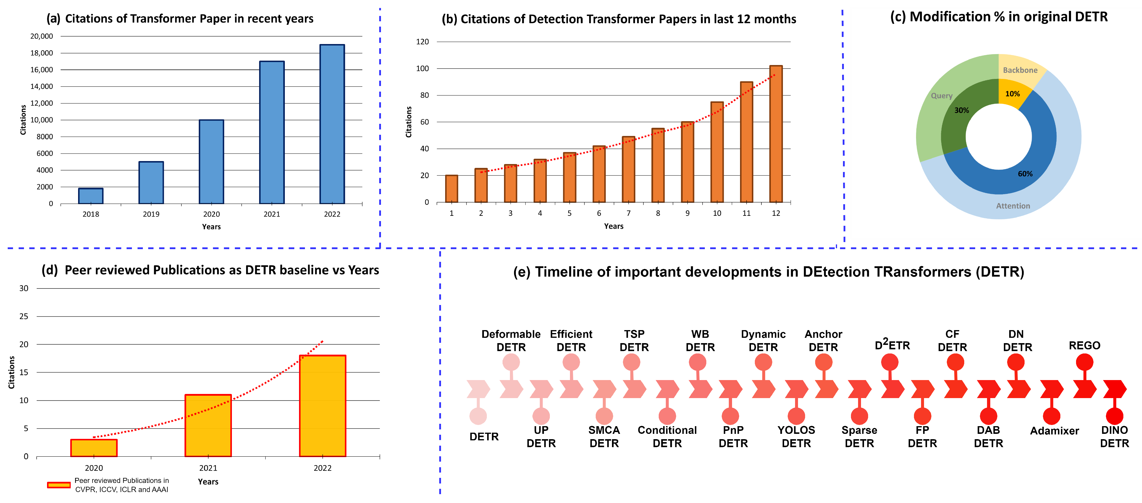 - An overview of the key building blocks of detection transformers to improve their performance further and future directions. We examine the impact of various key architectural design modules that impact network performance and training convergence to provide possible suggestions for future research. Readers interested in ongoing developments in detection transformers can refer to our Github repository; https://github.com/mindgarage-shan/transformer_object_detection_survey (accessed on 25 September 2025).