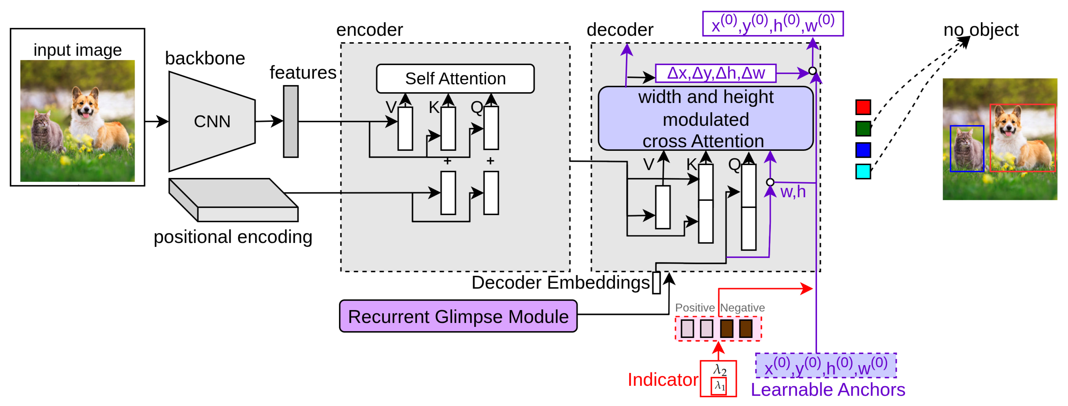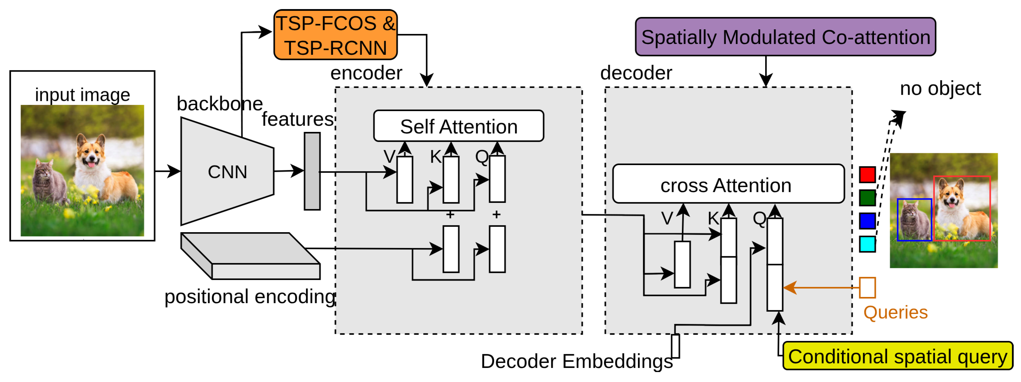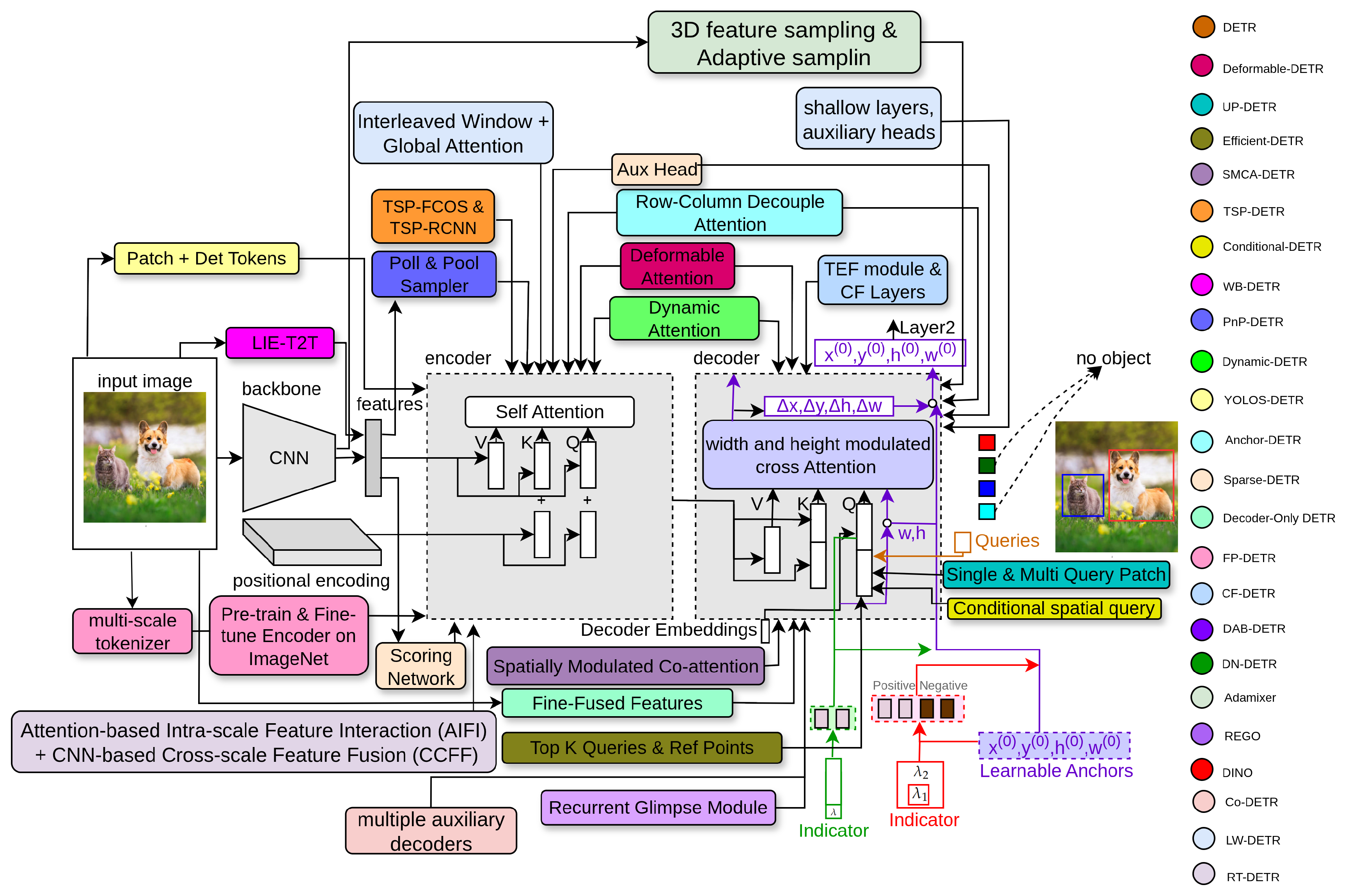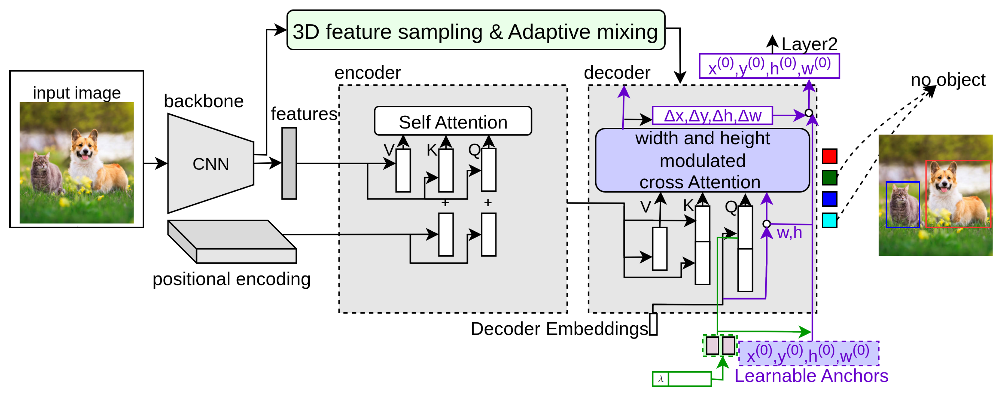DAB-DETR [72] GitHub https://github.com/IDEA-Research/DAB-DETR | ICLR 2022 | Anchor-boxes as queries, attention for different scale objects. | Positional prior for only foreground objects. |