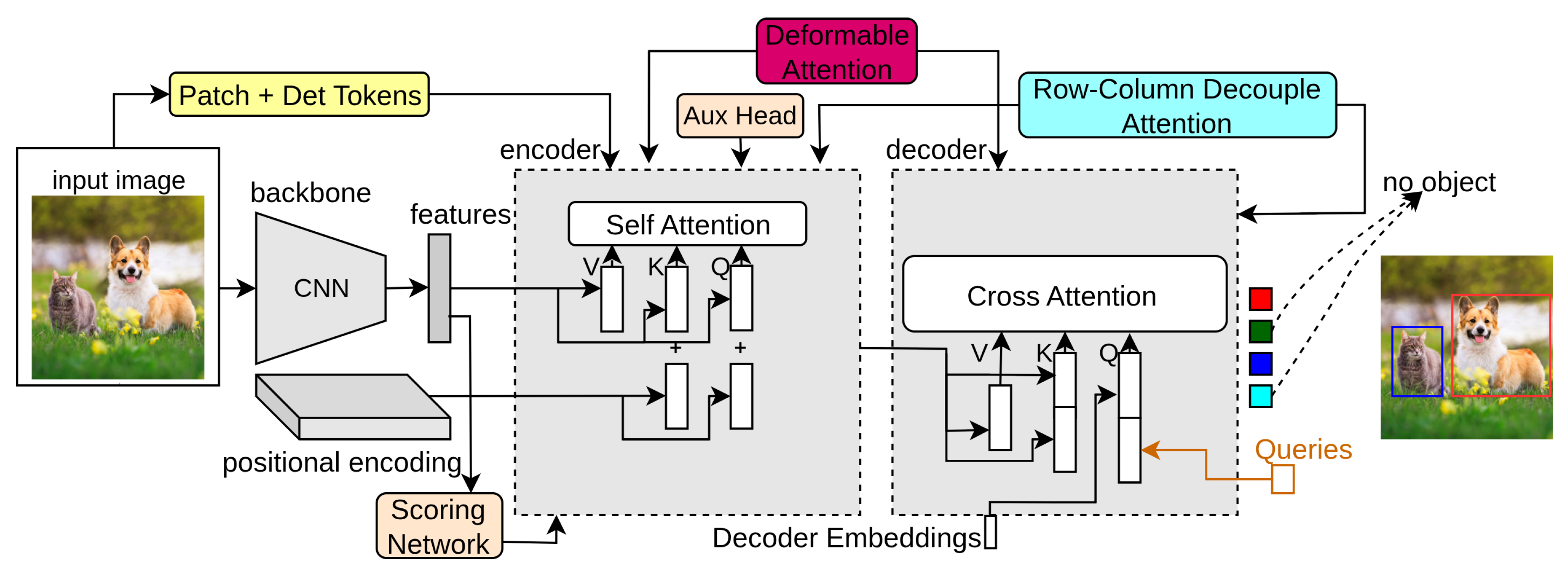 Co-DETR [39] GitHub https://github.com/Sense-X/Co-DETR | ICCV 2023 | Enhances encoder feature learning and decoder attention via collaborative hybrid assignments. | Increases training complexity due to multiple assignment heads. |