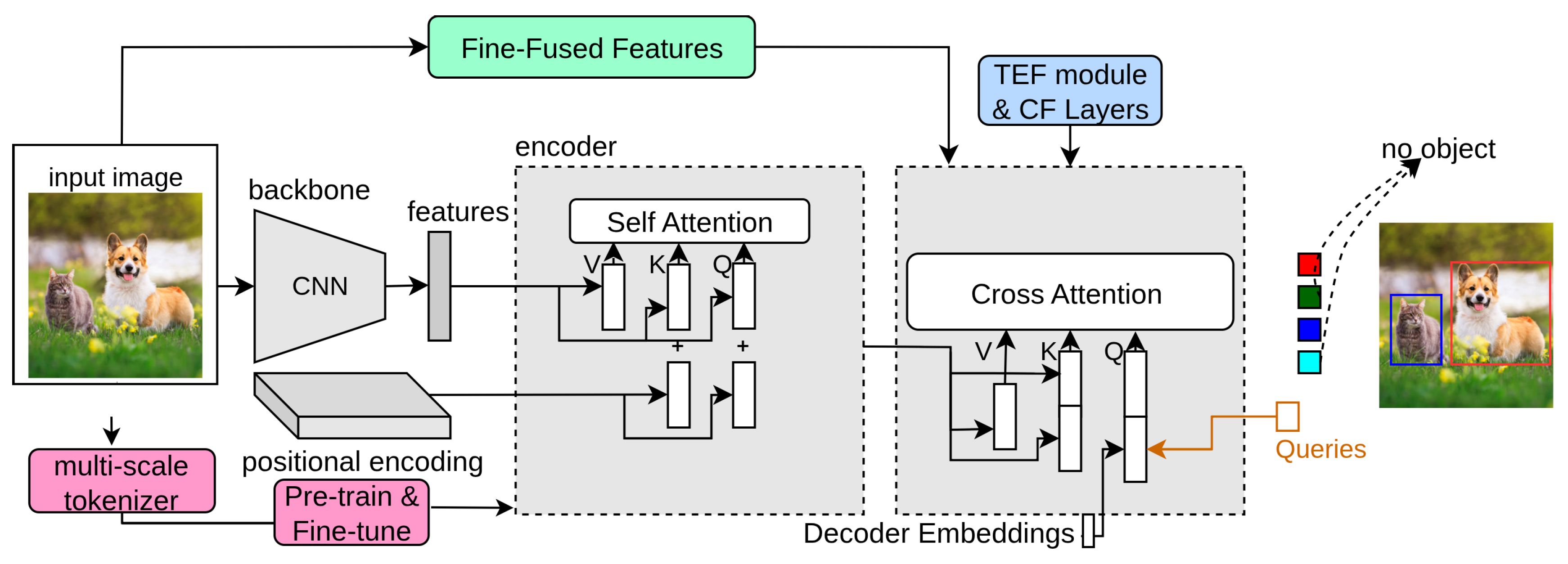 CF-DETR [34] GitHub https://github.com/facebookresearch/detr | AAAI 2022 | Refine coarse features to improve localization accuracy of small objects. | Addition of three new modules increase network size. |