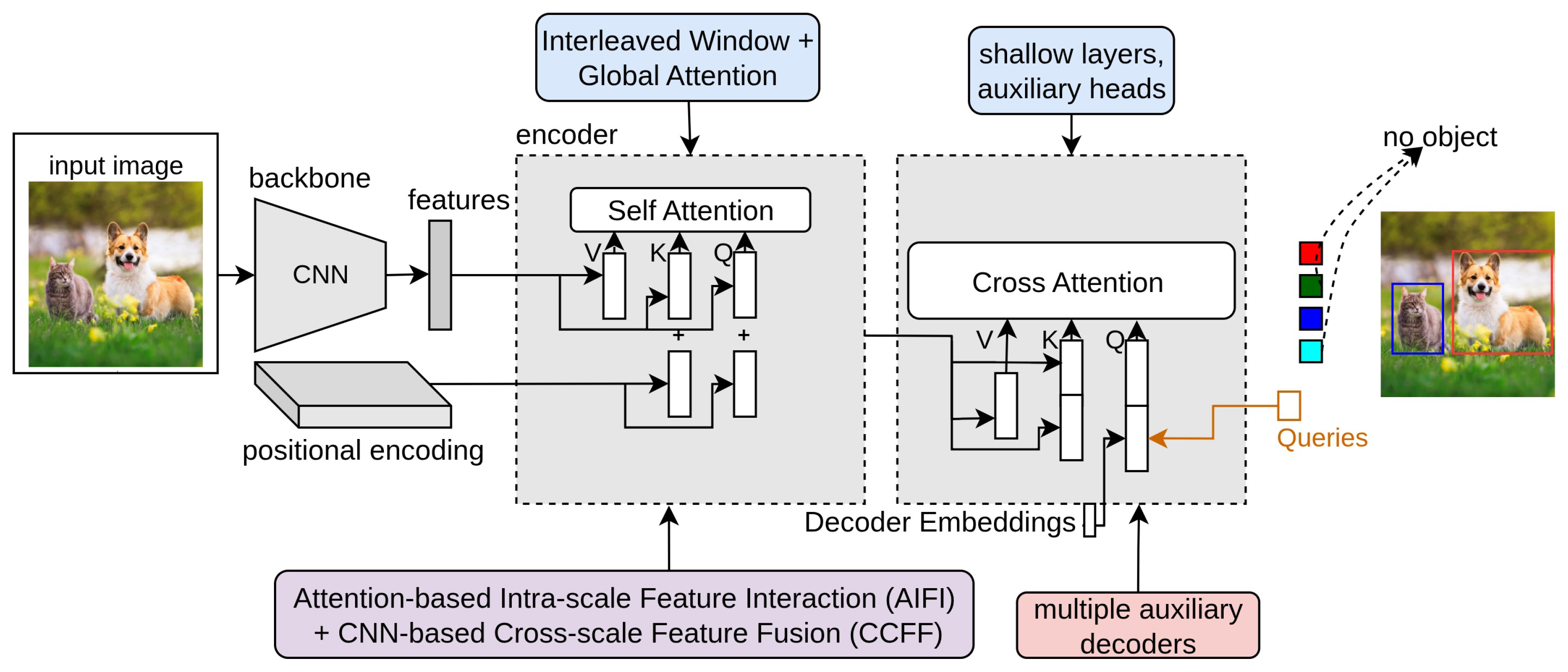 LW-DETR [40] GitHub https://github.com/Atten4Vis/LW-DETR | arXiv 2024 | Achieves real-time detection with a lightweight transformer design using optimized ViT encoder and window attention. | Limited evaluation on benchmarks; less mature than YOLO-style detectors. |
