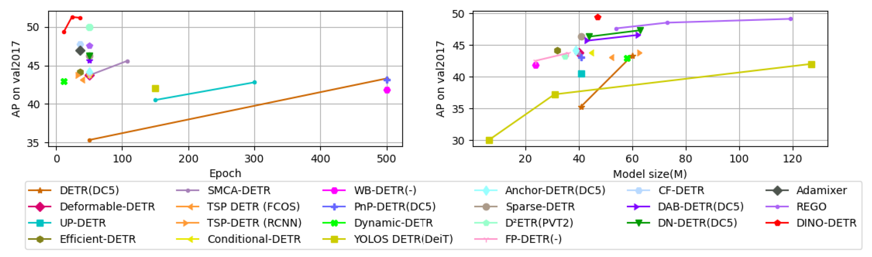 Anchor-DETR [30] GitHub https://github.com/megvii-research/AnchorDETR | DC5-ResNet-50 * | AAAI 2022 | 50 | 151 | 39 | 44.2 | 64.7 | 47.5 | 24.7 | 48.2 | 60.6 |
