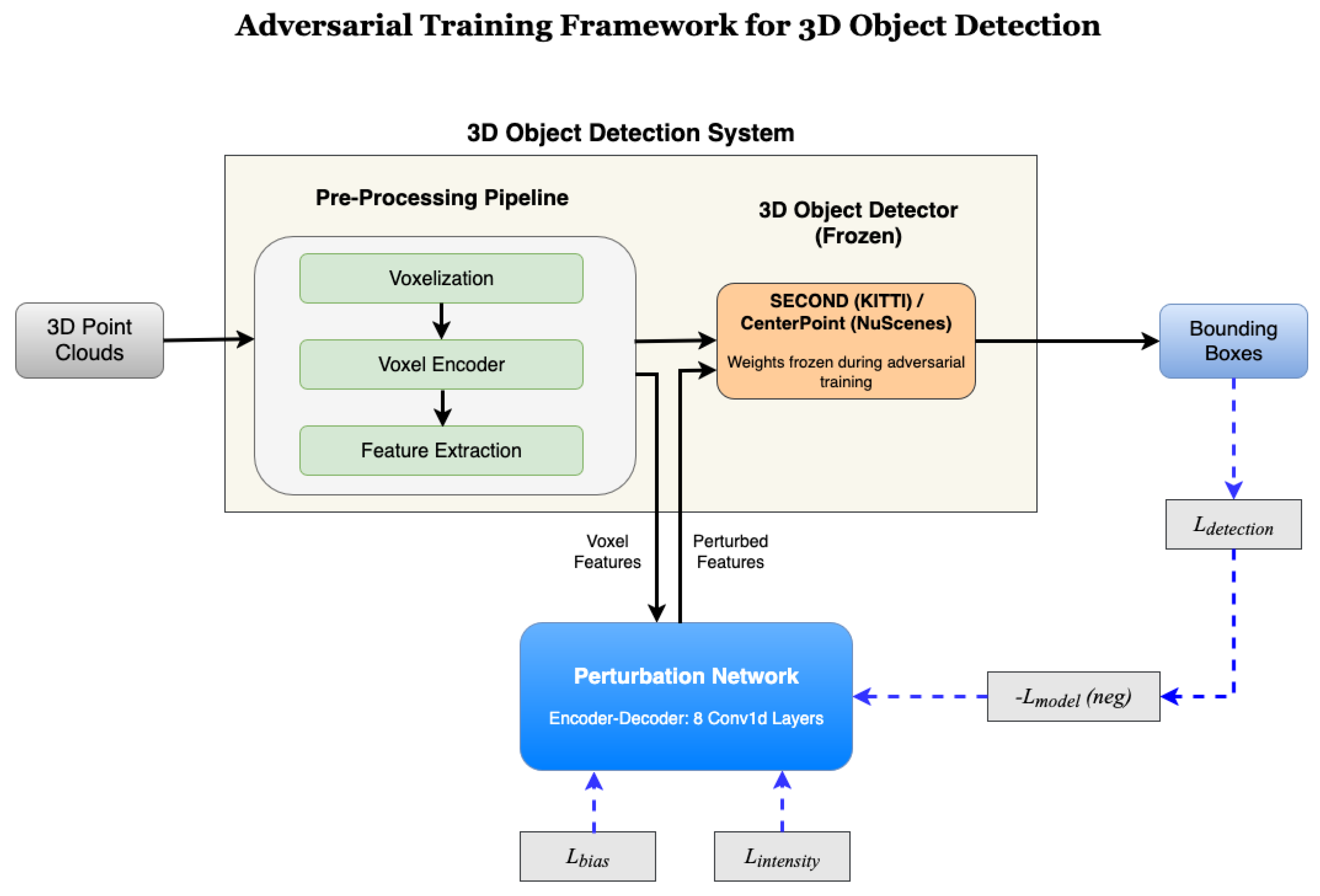 Future research directions emerge from these limitations. Immediate extensions include developing adaptive perturbation bounds based on object distance and sensor specifications, and extending the approach to multi-modal fusion systems that combine LiDAR with camera data. Architectural generalization to support point-based and transformer-based detectors would broaden the method’s applicability. Longer-term goals include developing physical adversarial patches that maintain effectiveness under real-world constraints and creating certified robustness guarantees specifically tailored for 3D perception systems. The development of class-weighted defense mechanisms that prioritize protecting vulnerable road users (pedestrians, cyclists) represents a particularly important direction given our findings on size-dependent vulnerabilities.