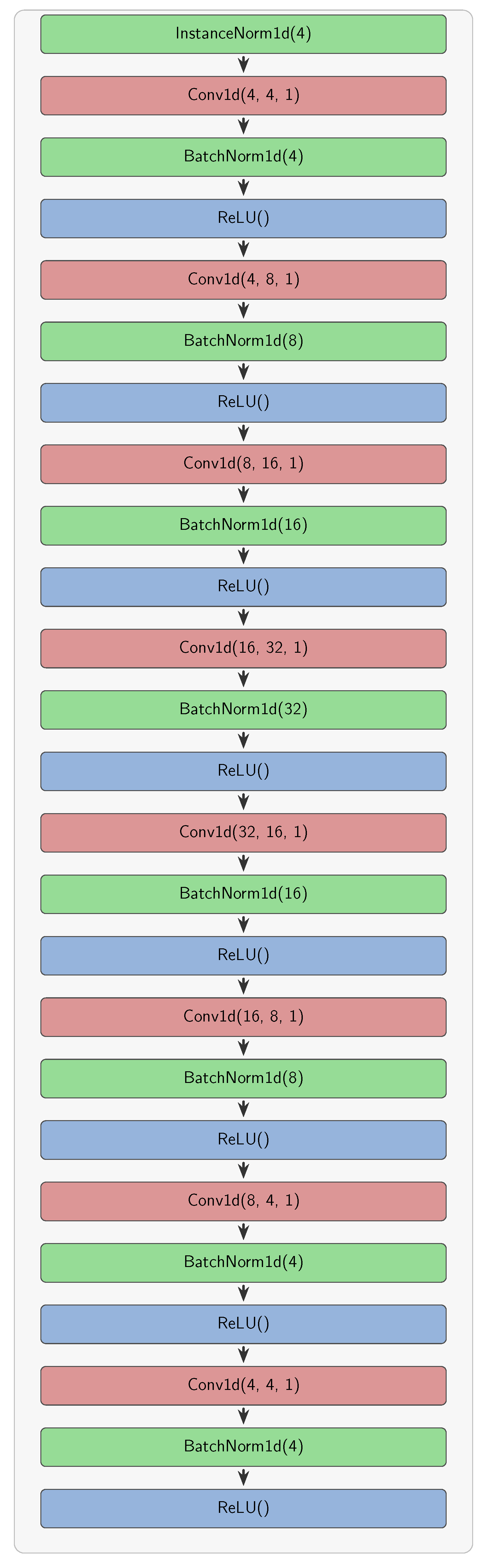 Detailed architecture of the adversarial ConvNet. The network employs an encoder–decoder structure with 8 Conv1d layers, each using kernel size 1 for point-wise operations on individual voxel features. The encoder progressively increases feature dimensions (4→8→16→32) to learn complex perturbation patterns, while the decoder symmetrically reduces dimensions (32→16→8→4) to match the input feature space. Instance normalization preprocesses inputs, with batch normalization and ReLU activations between convolutional layers. This architecture processes variable-length point clouds efficiently while generating constrained perturbations through learned parameters optimized during adversarial training.