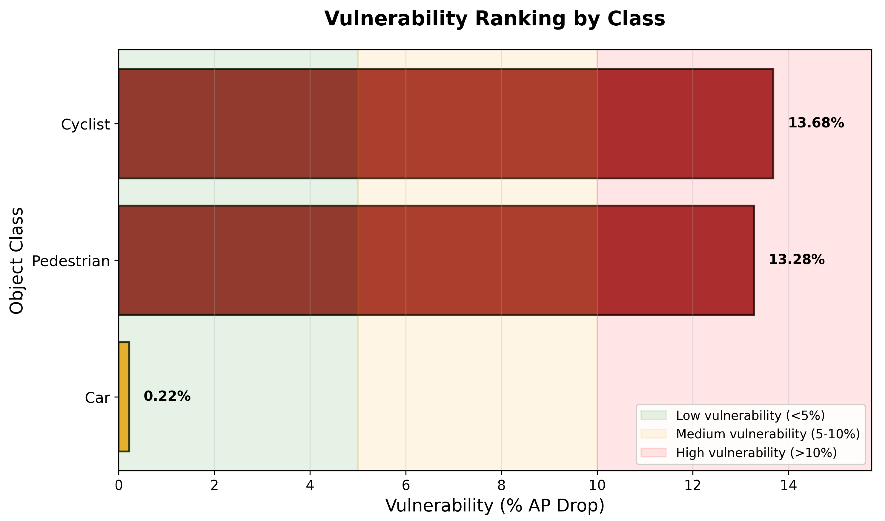 Table 4. The weighted average mAP reduction of 23.90% demonstrates the increased vulnerability of multi-class urban detection scenarios. Infrastructure objects show high susceptibility, with the barrier class experiencing a 68.35% drop and the traffic cone class showing a 29.83% reduction. Pedestrians also show a notable vulnerability at a 31.69% reduction. In contrast, larger vehicles demonstrate greater resilience, with the bus class showing only 5.33% degradation and the car class showing an 8.88% reduction.