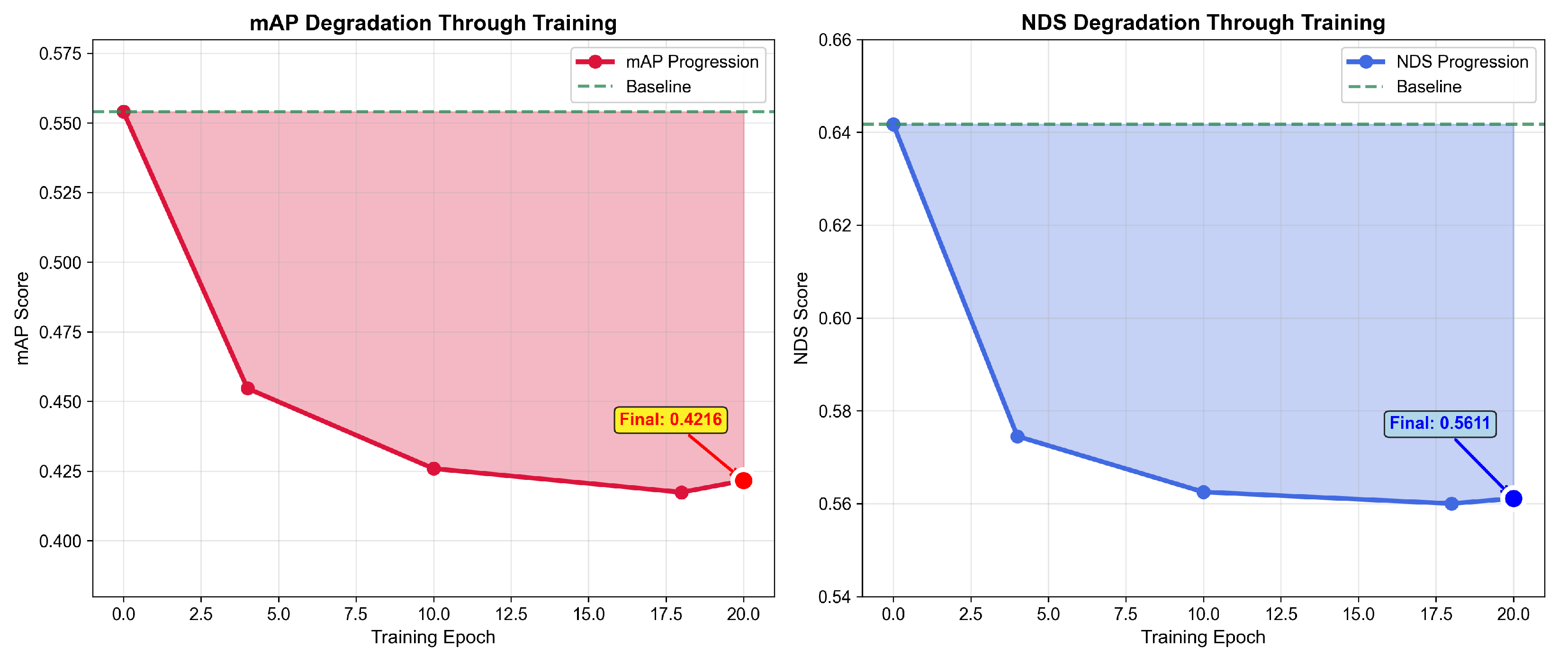 Figure 8 illustrates the progression of both mAP and NDS metrics throughout the 20-epoch training process. The mAP degradation shows initial impact, stabilizing around the final 23.9% reduction. The stabilization of attack effectiveness after epoch 10 suggests that the adversarial training reaches an equilibrium between maintaining perturbation constraints and maximizing detection degradation.