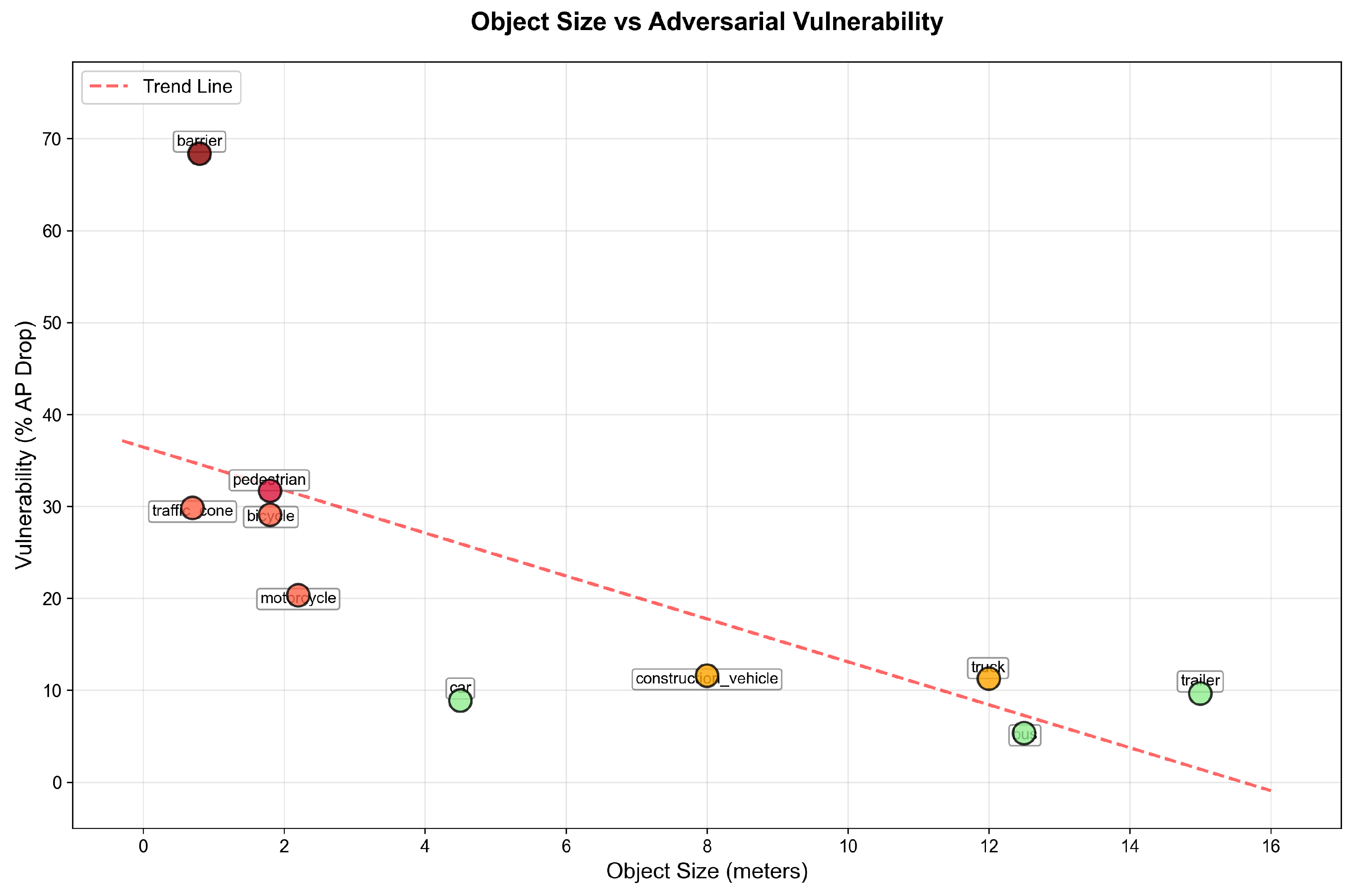 The identified inverse relationship between object size and adversarial vulnerability presents a fundamental challenge for autonomous vehicle safety. Smaller objects, precisely those representing the most vulnerable road users, demonstrate disproportionate susceptibility to adversarial attacks. With perturbations averaging only 0.088% (KITTI) and 0.045% (NuScenes) of the original point cloud magnitude, these attacks remain imperceptible while causing substantial detection failures.