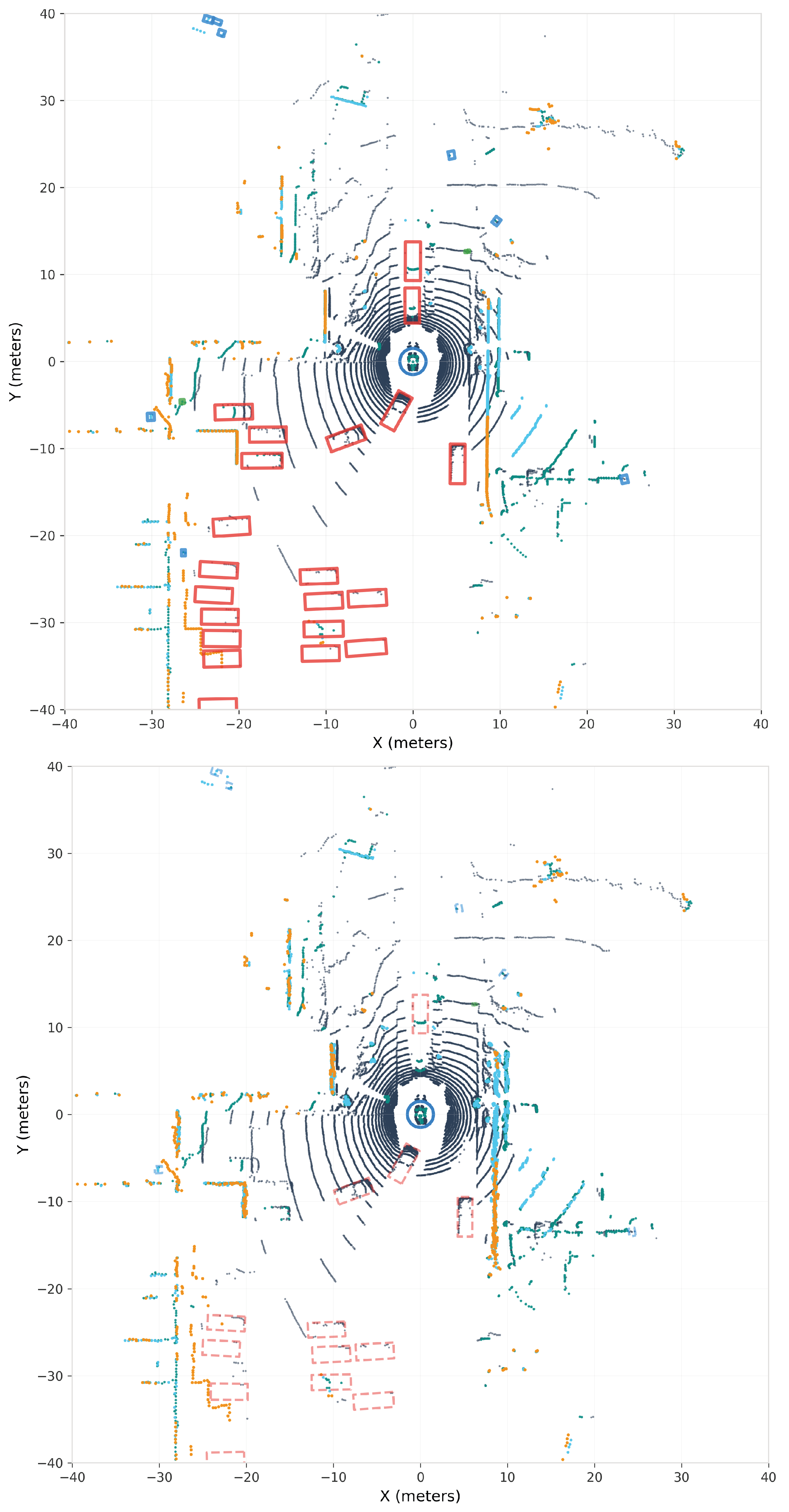 Figure 10 provides a visual demonstration of the adversarial attack’s impact on a representative NuScenes scene. The comparison reveals substantial detection degradation, with numerous ground-truth objects (solid boxes) either becoming degraded detections (dashed boxes) or completely missed (missing boxes) after perturbation. The visualization particularly highlights the vulnerability of smaller objects and infrastructure elements, consistent with our quantitative findings.