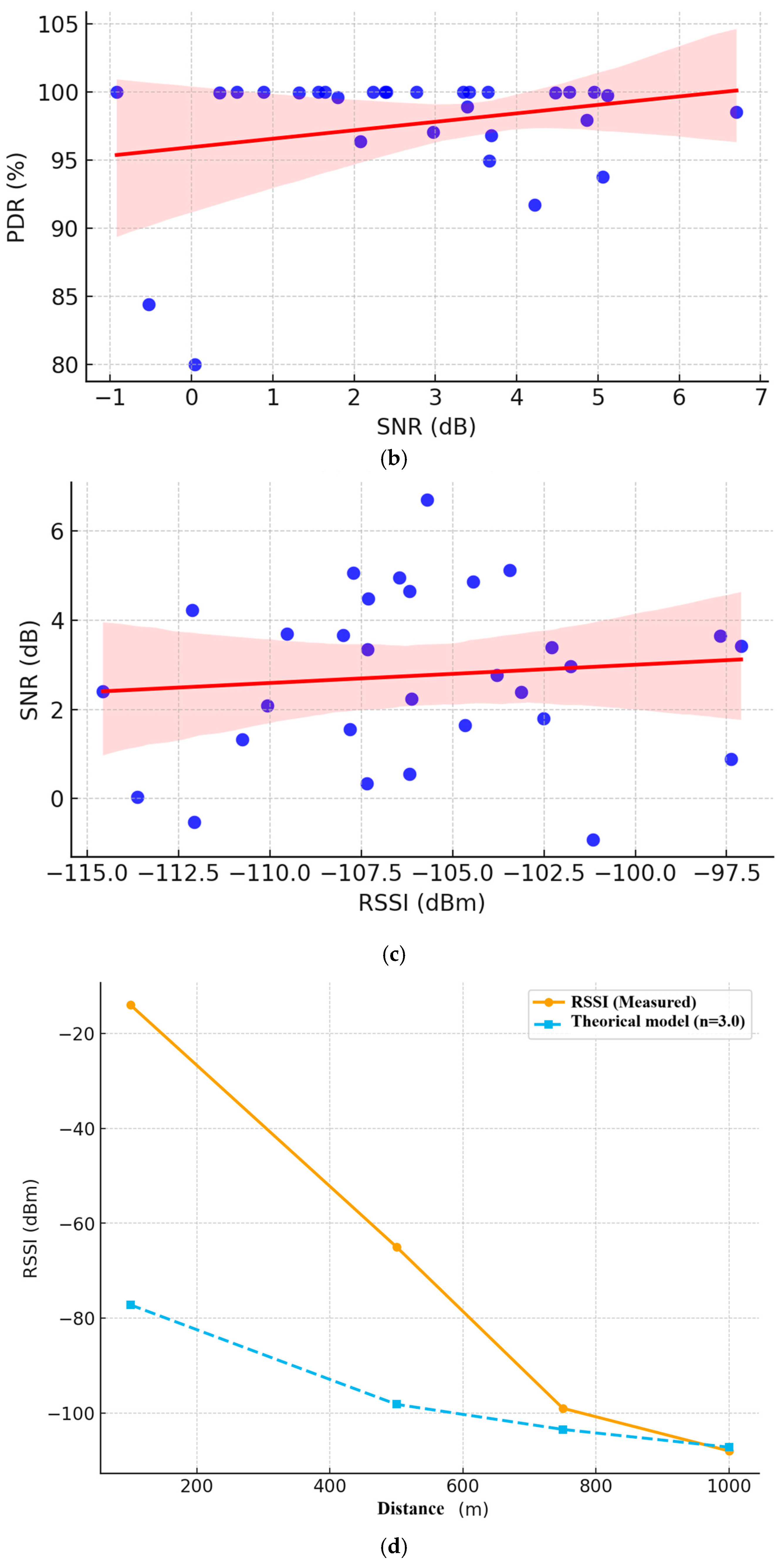 - Metrics collected: RSSI, SNR, PDR, and node autonomy (battery duration).