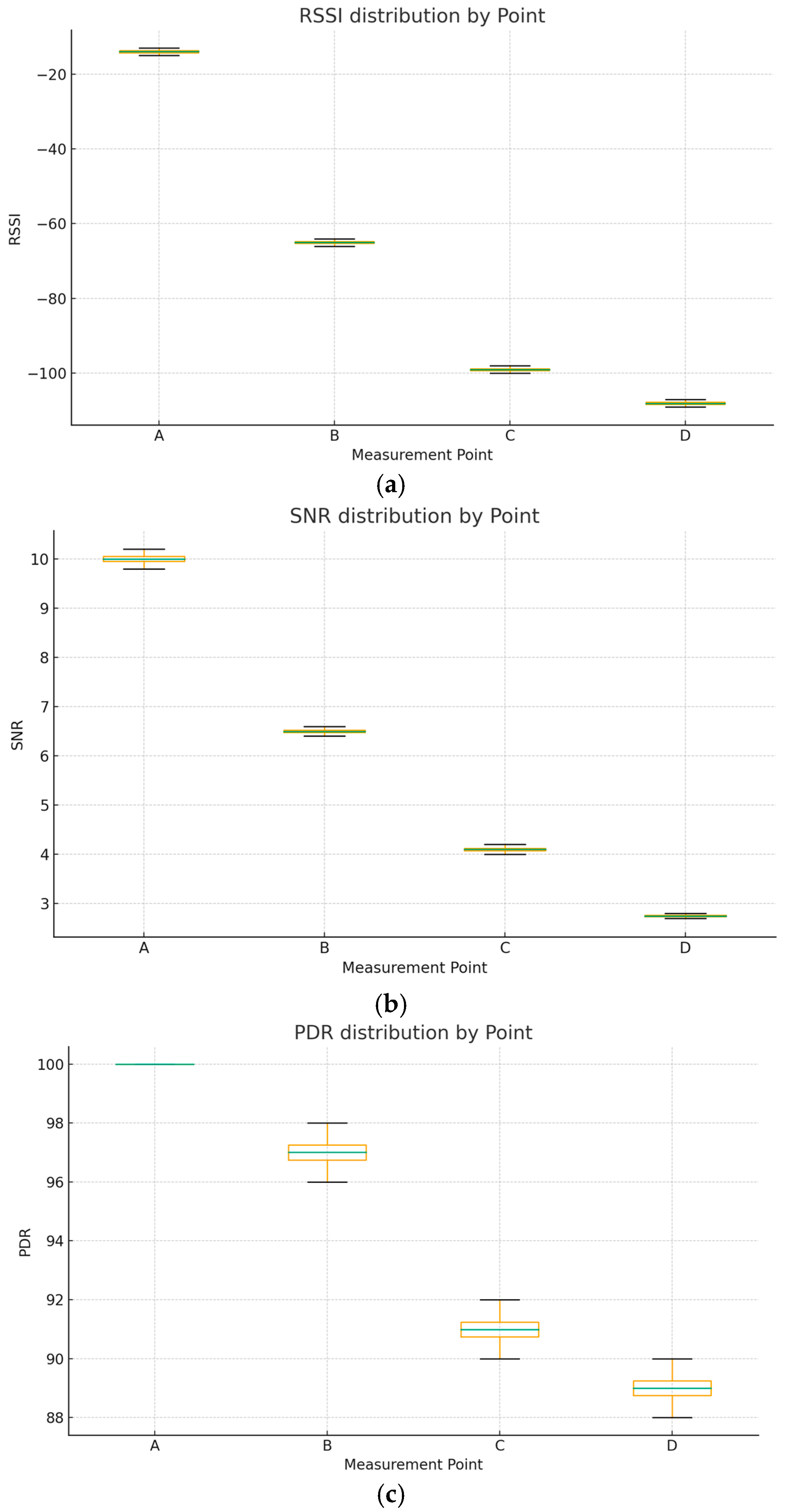 | Point | Coordinates | Distance (m) | Altitude (m) | RSSI (dBm) | SNR (dB) | PDR (%) |