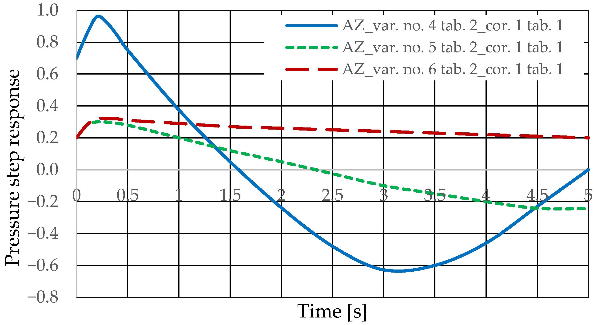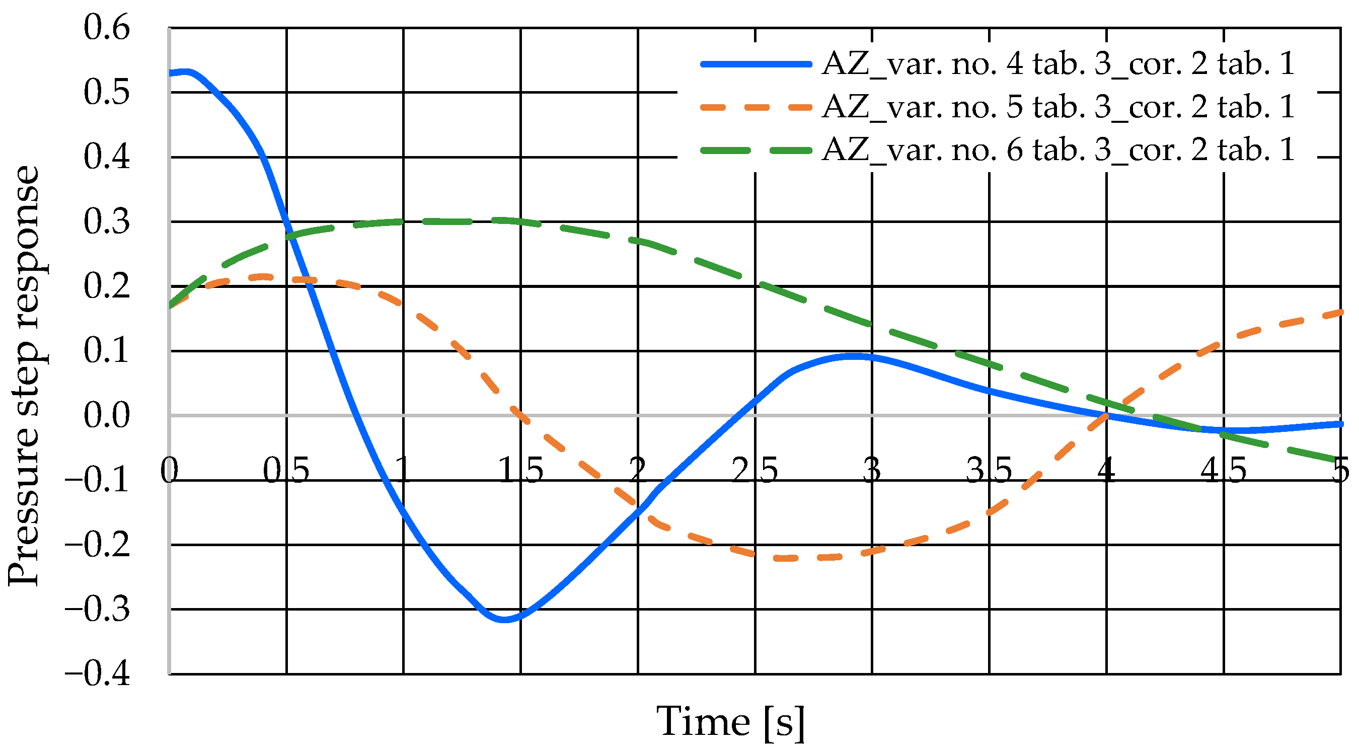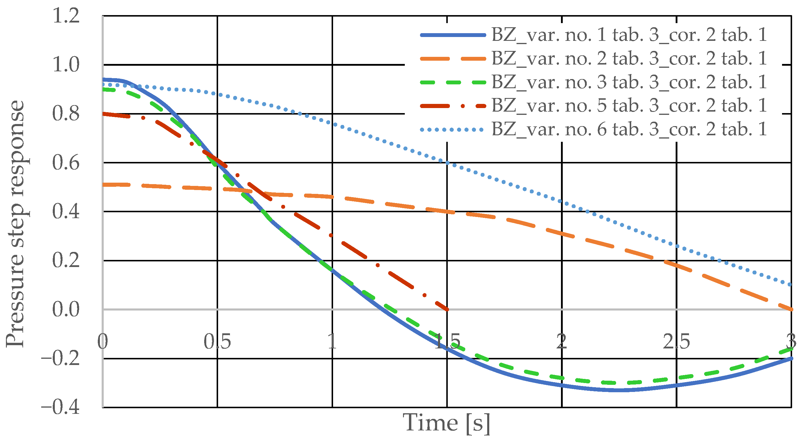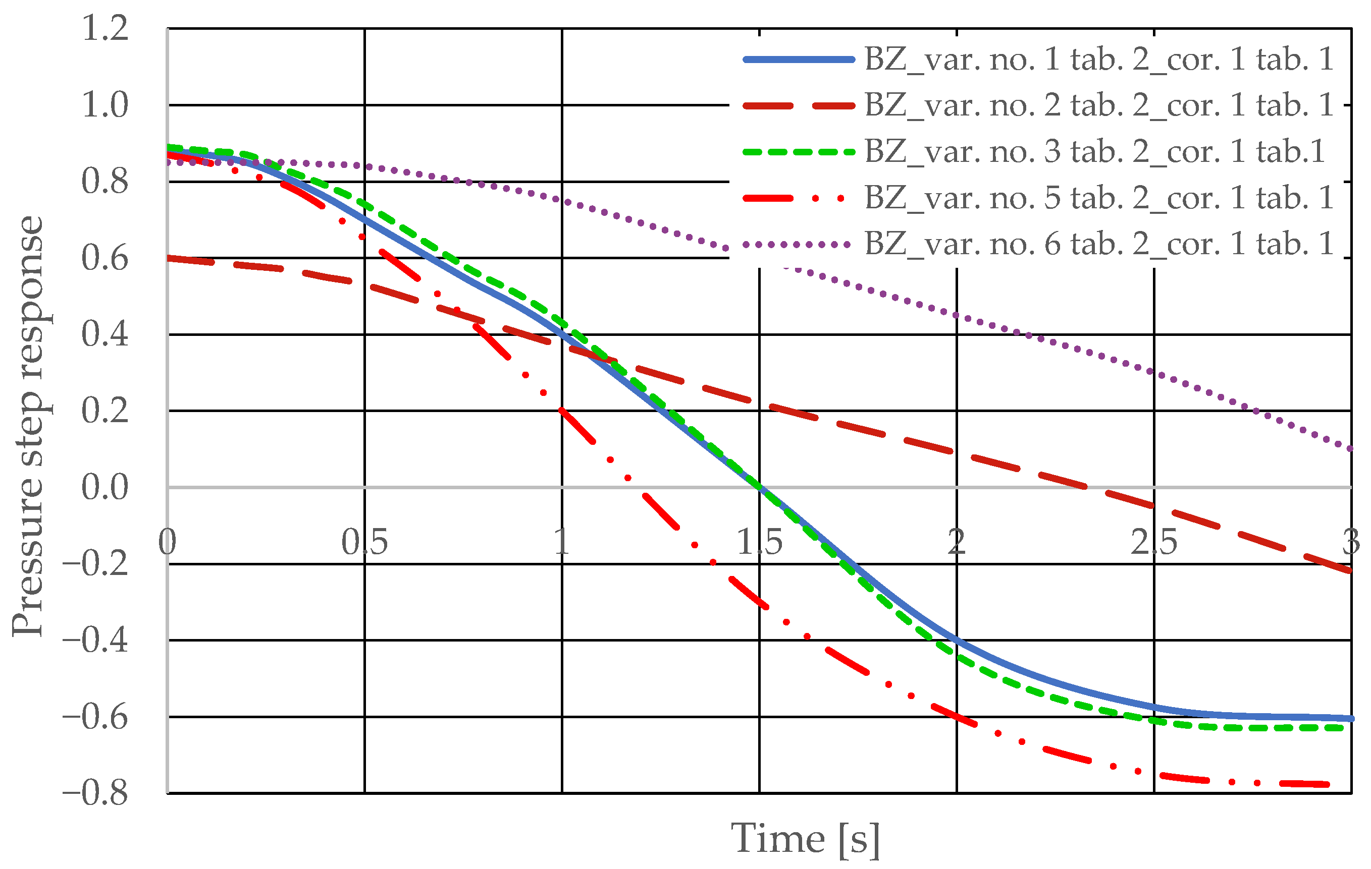 - The change in the step response as a function of the design parameters of the hydrostatic drive and regulator is more pronounced if the hydraulic correction accumulator is the only corrective element operating in the hydrostatic drive, i.e., in variant BZ, when the hydraulic correction accumulator is inserted into the hydrostatic drive after the hydraulic accumulator is disconnected from the hydrostatic drive (see Figure 1).