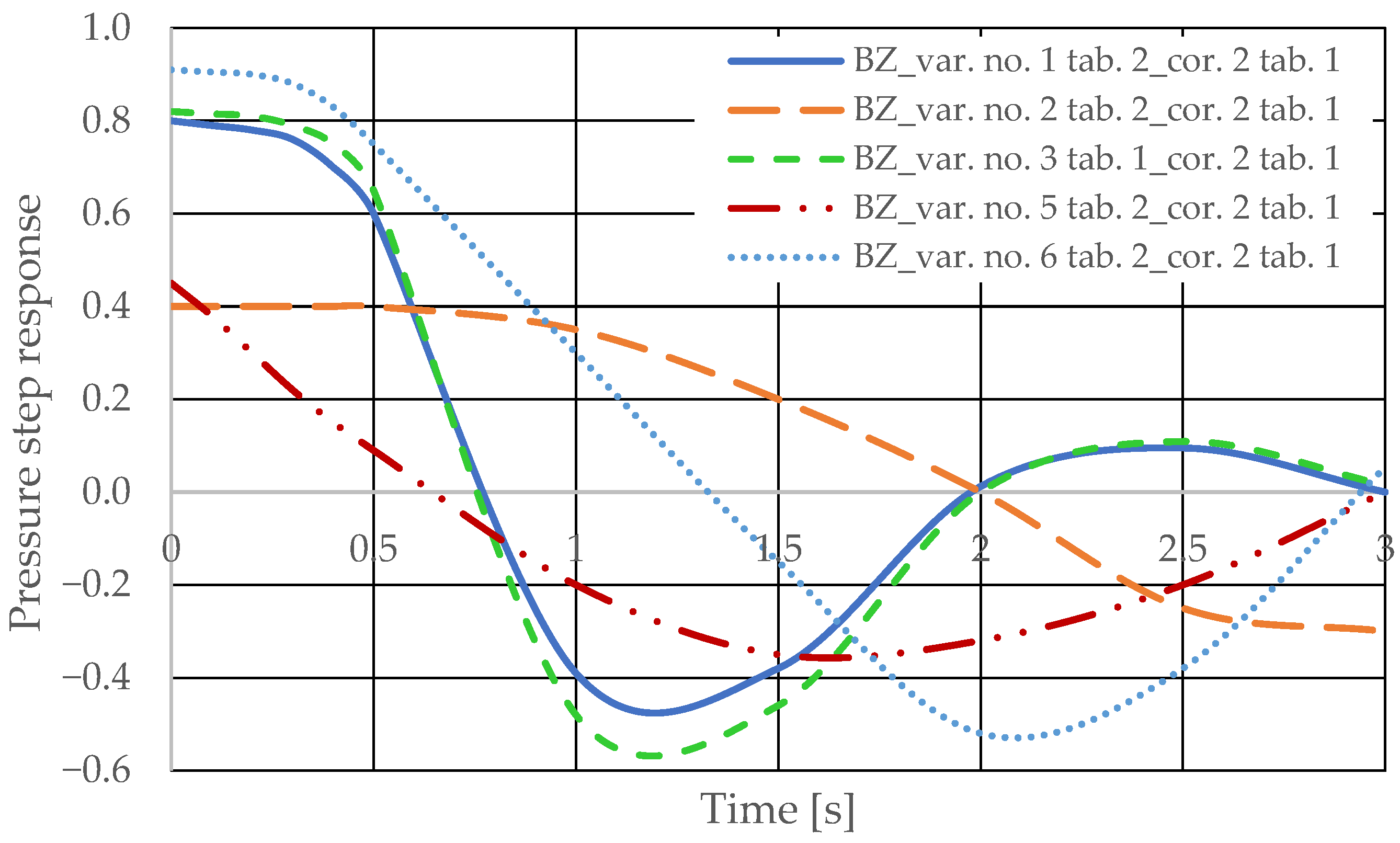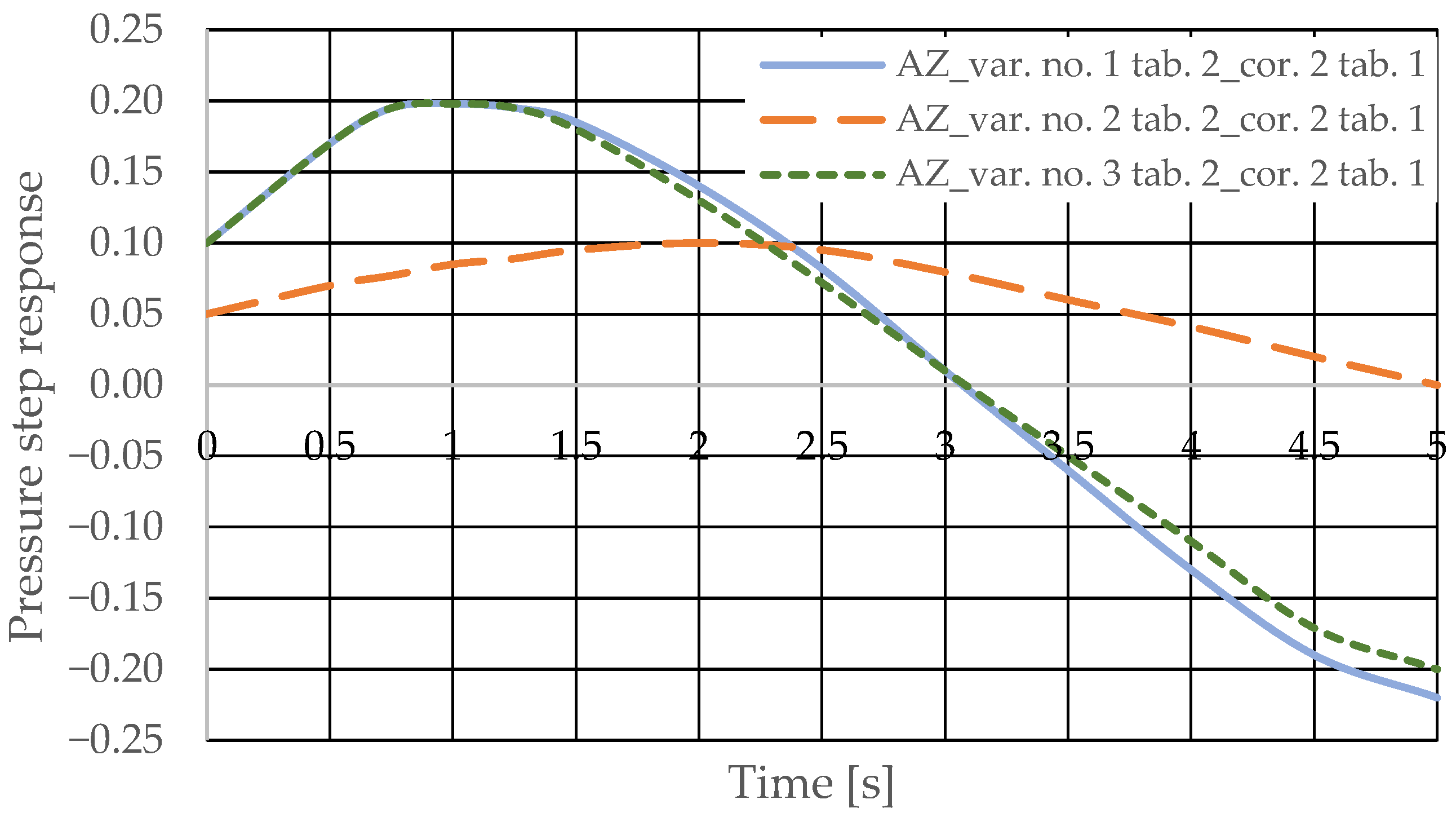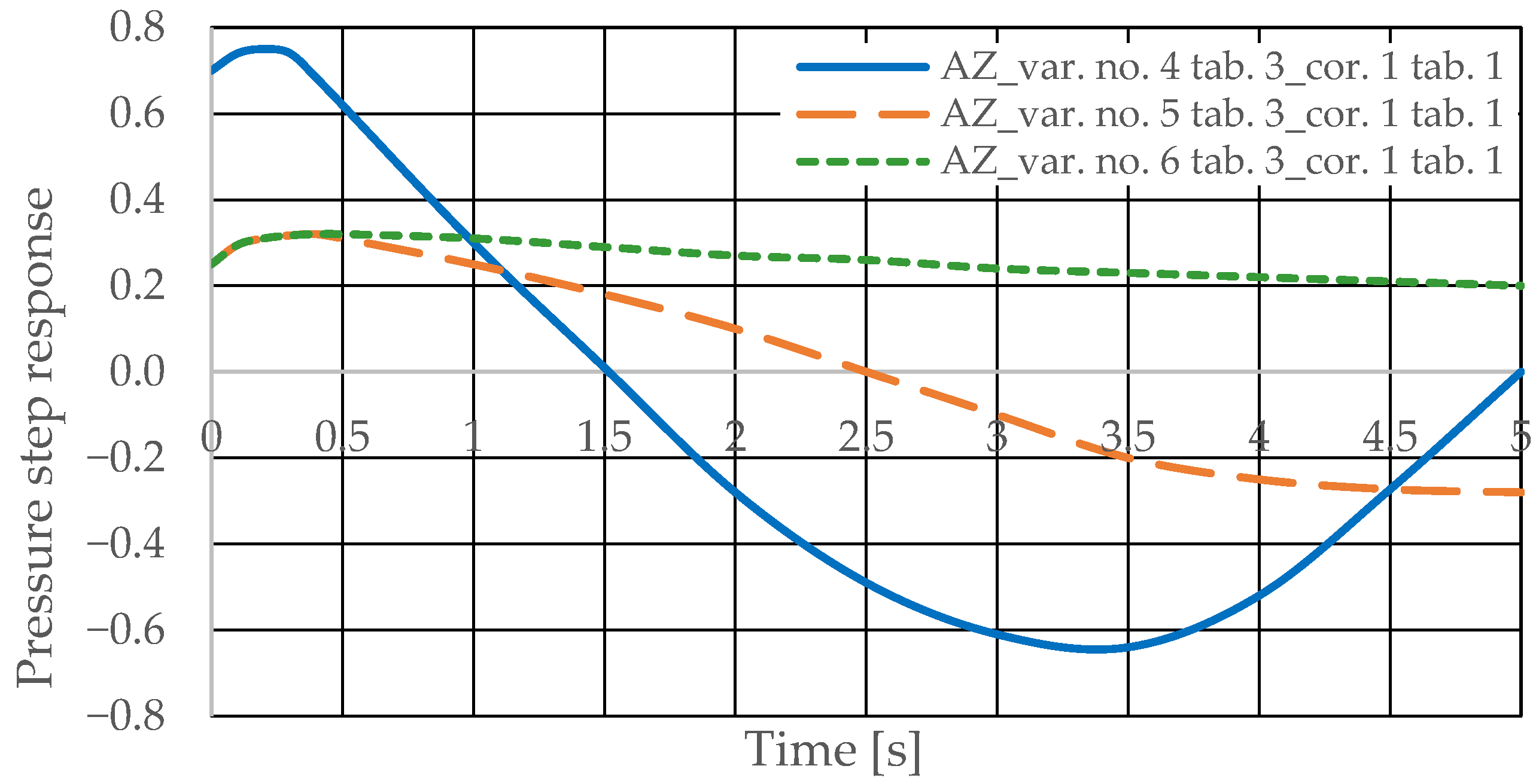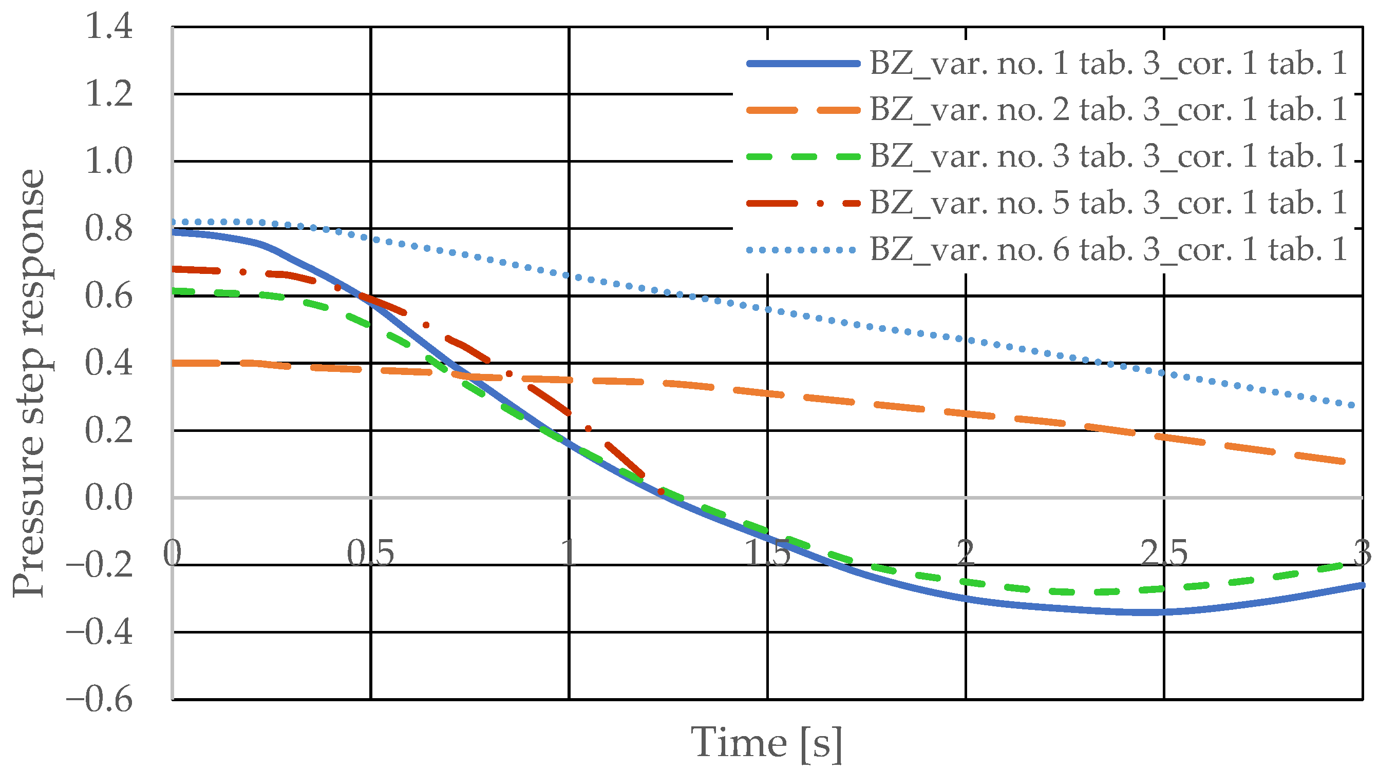 - The change in the step response as a function of the design parameters of the hydrostatic drive and regulator is more pronounced if the hydraulic correction accumulator is the only corrective element operating in the hydrostatic drive, i.e., in variant BZ, when the hydraulic correction accumulator is inserted into the hydrostatic drive after the hydraulic accumulator is disconnected from the hydrostatic drive (see Figure 1).