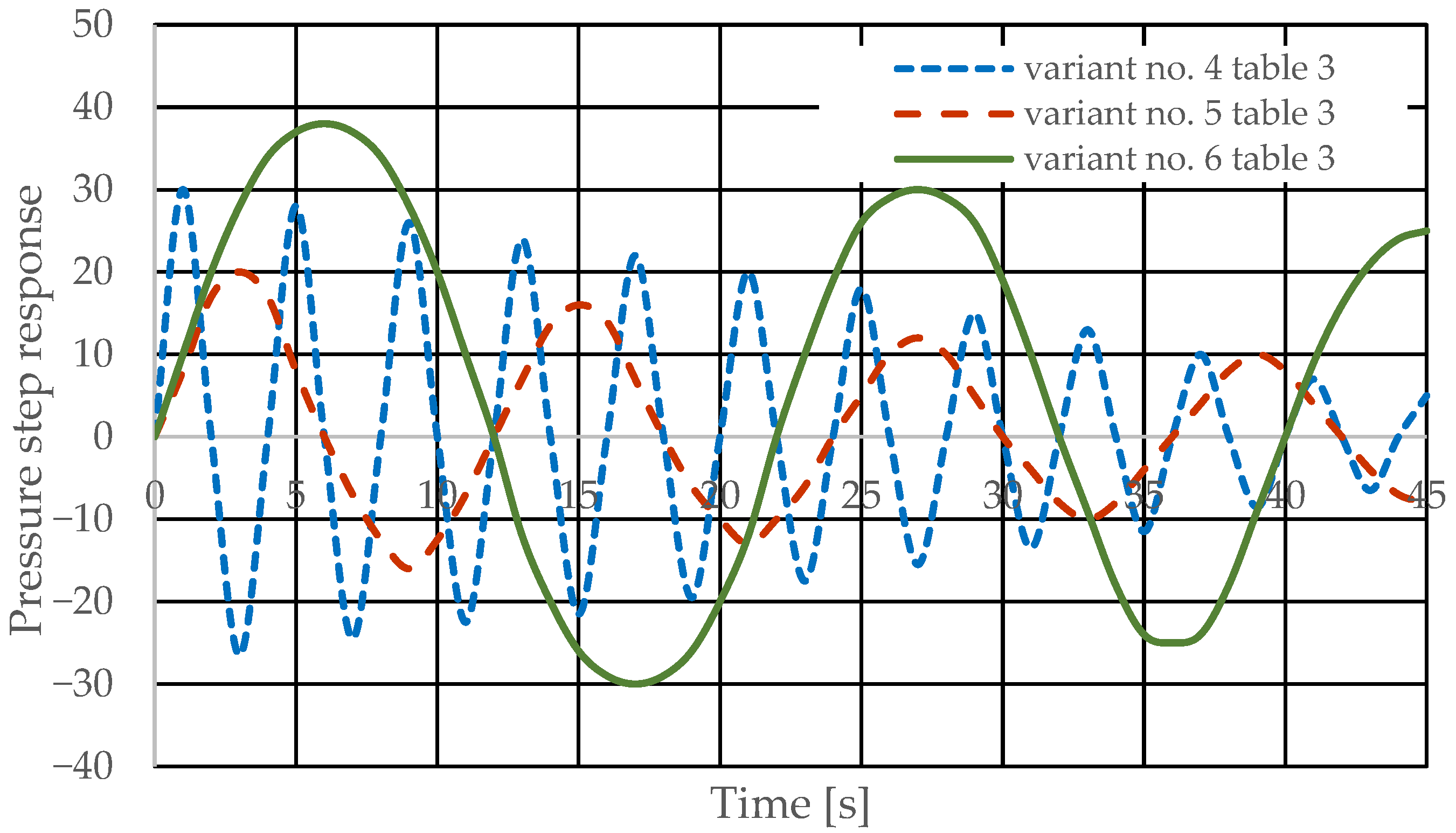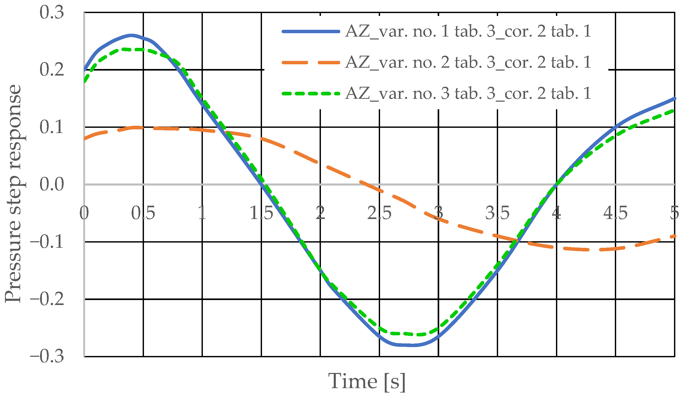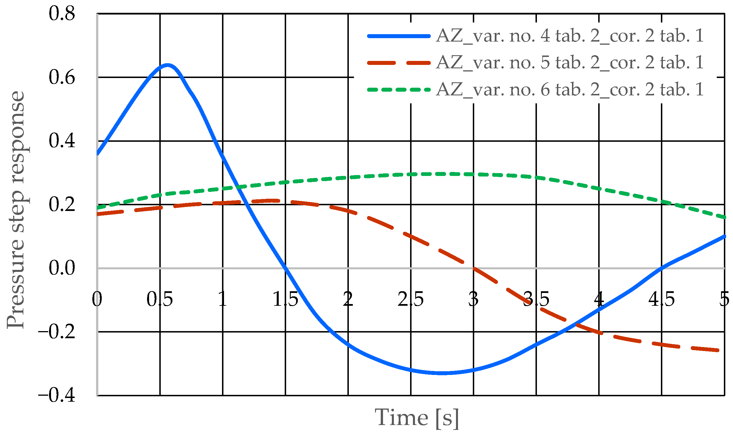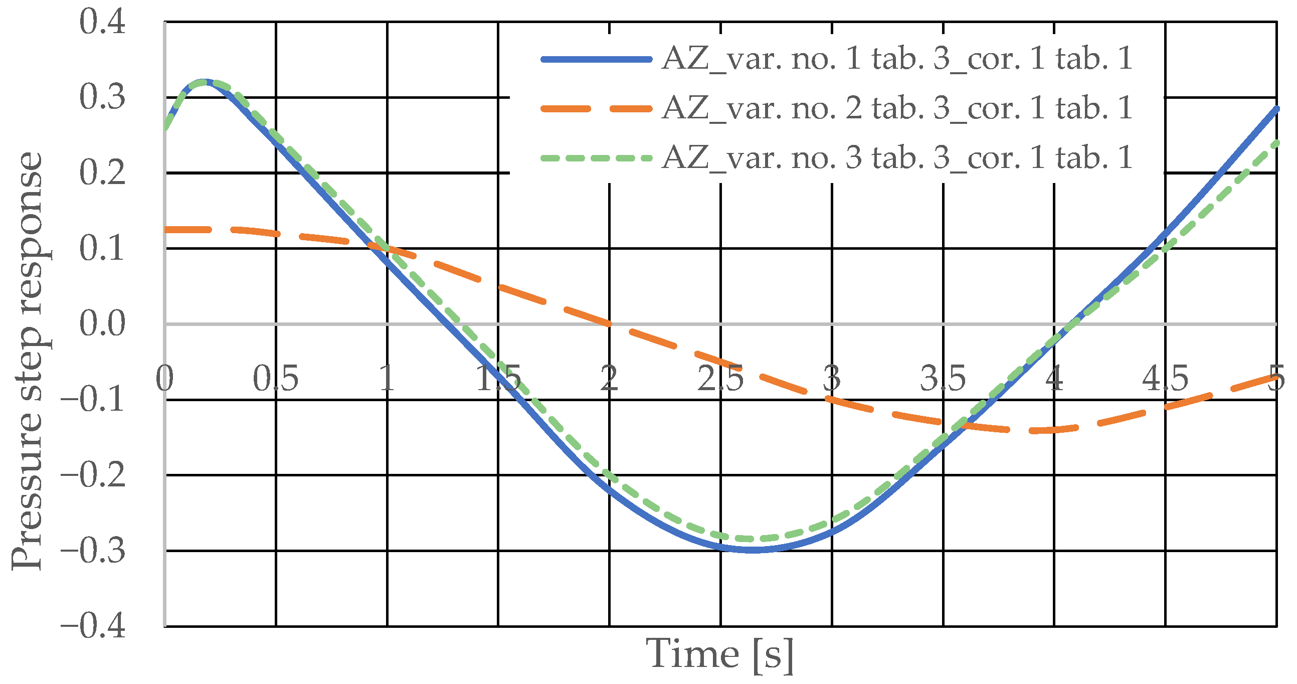- The change in the step response as a function of the design parameters of the hydrostatic drive and regulator is more pronounced if the hydraulic correction accumulator is the only corrective element operating in the hydrostatic drive, i.e., in variant BZ, when the hydraulic correction accumulator is inserted into the hydrostatic drive after the hydraulic accumulator is disconnected from the hydrostatic drive (see Figure 1).