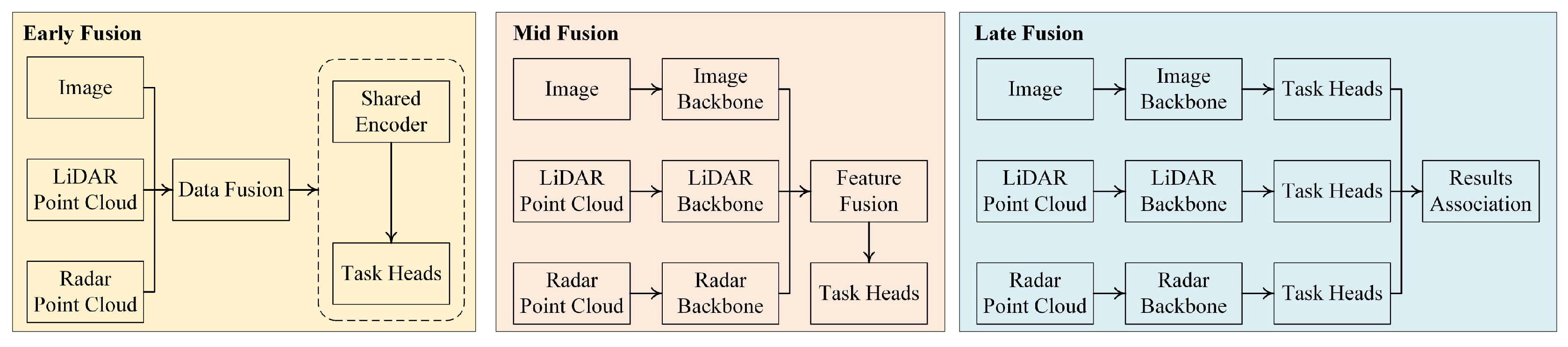 - Temporal complementarity (e.g., Radar providing velocity between LiDAR frames).