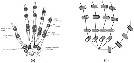 Simplification of the Human Hand Model (a) 23-DOFs model of the human hand. (b) The simplified model of 10 active degrees of freedom and 4 passive degrees of freedom for the proposed rigid–flexible coupled dexterous hand. Each finger’s MCP joint is driven by a motor, the PIP joint is a passive joint, and the DIP joint is a passive degree of freedom.
